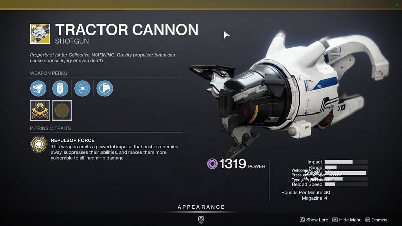 Tractor Cannon is an 80 RPM exotic void shotgun that will be an essential part of the inventory. The weapon boasts an extended barrel coupled with an exotic perk called "The Scientific Method." This perk increases the speed and handling of the weapon upon damaging an enemy.