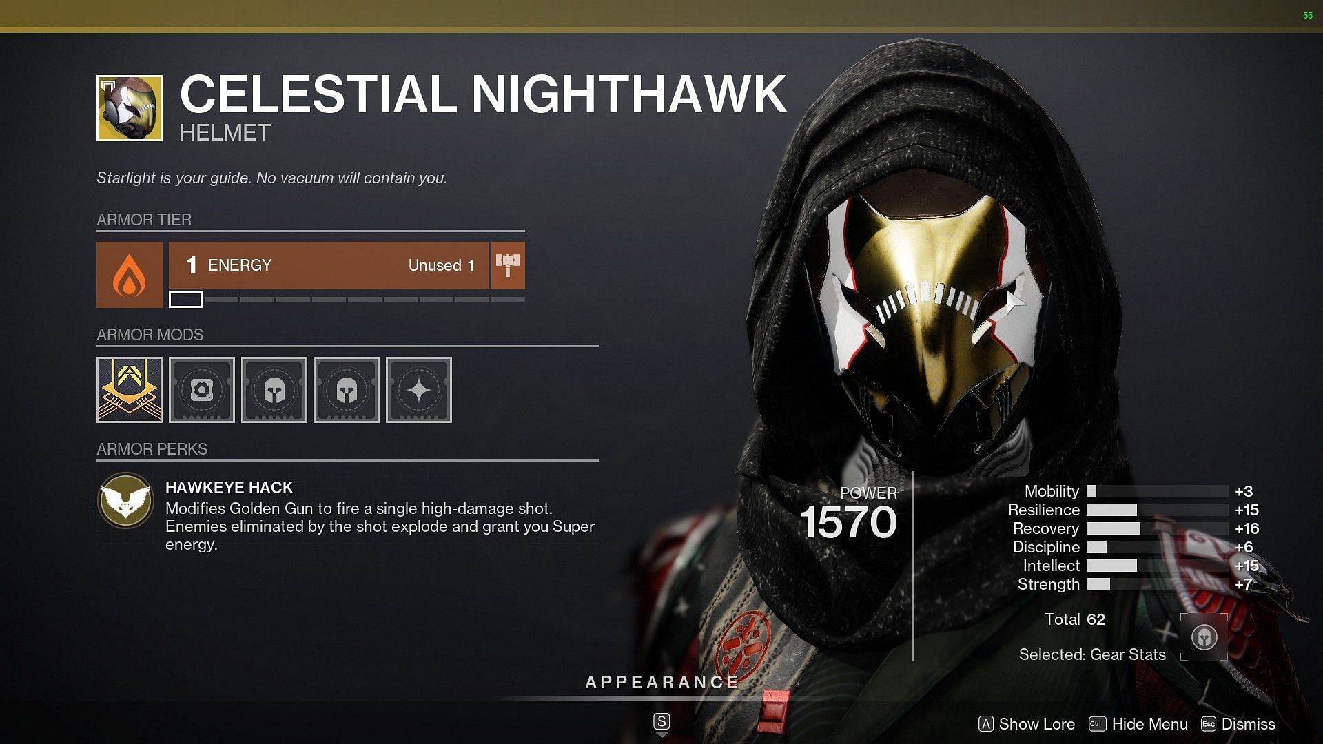- Celestial Nighthawk Exotic Helmet for Hunters.