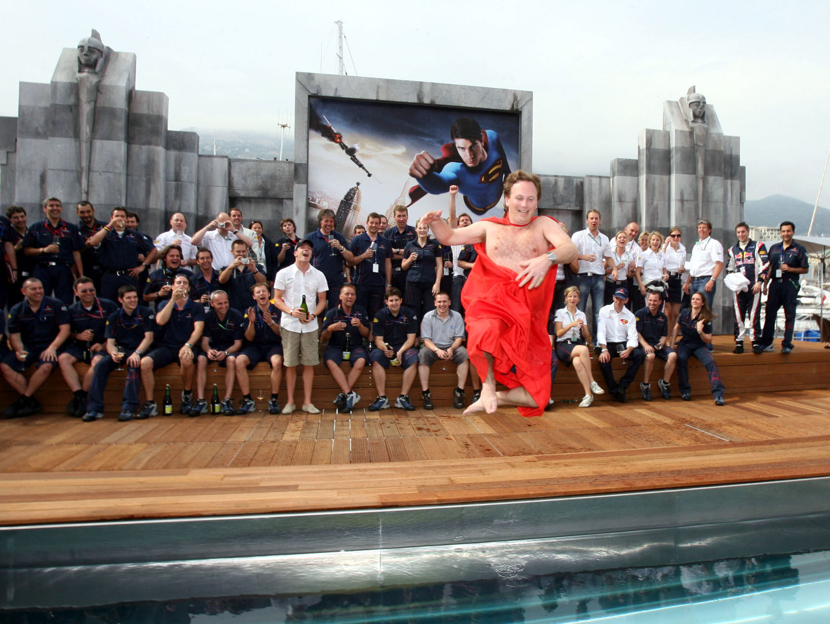 - Christian Horner, Team Principal of Red Bul Racing jumped in a swimming pool to celebrate Red Bull’s first podium at the 2006 Monaco Grand Prix, with David Coulthard.