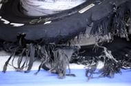 Ferrari’s Felipe Massa’s shredded tyre is seen in the pits at the Silverstone circuit during the British Grand Prix