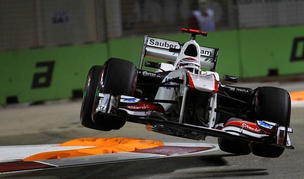 Kobayashi was clearly pushing hard for a top ten finish and fell to the notorious 'Singapore Sling' chicane on turn 10 where he rapidly ran over the kerbs and proceeded to take flight briefly. When he came back down, he found himself unable to stop his Sauber from crashing into the wall.
