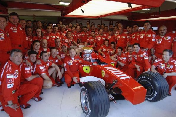 Team Ferrari pose for a photo after winning the the 2006 San Marino Grand Prix (Courtesy: Getty Images)