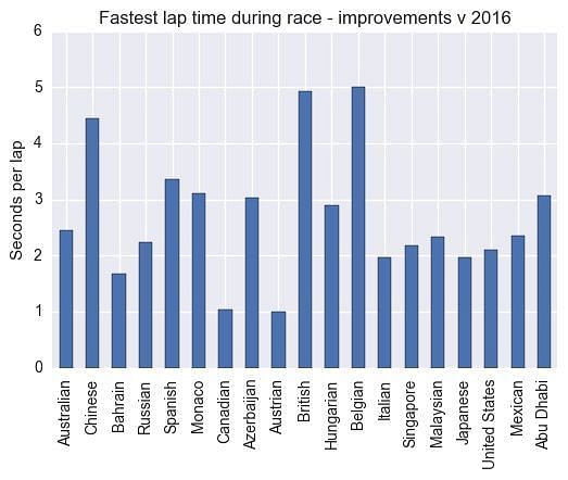 In order to assess the speed improvement achieved in 2017, we’ve chosen three different measures of lap time: fastest qualifying time, fastest lap time during a race, and the median lap time of the winning driver. We compare the times for 2017 with those achieved on the same tracks in 2016.