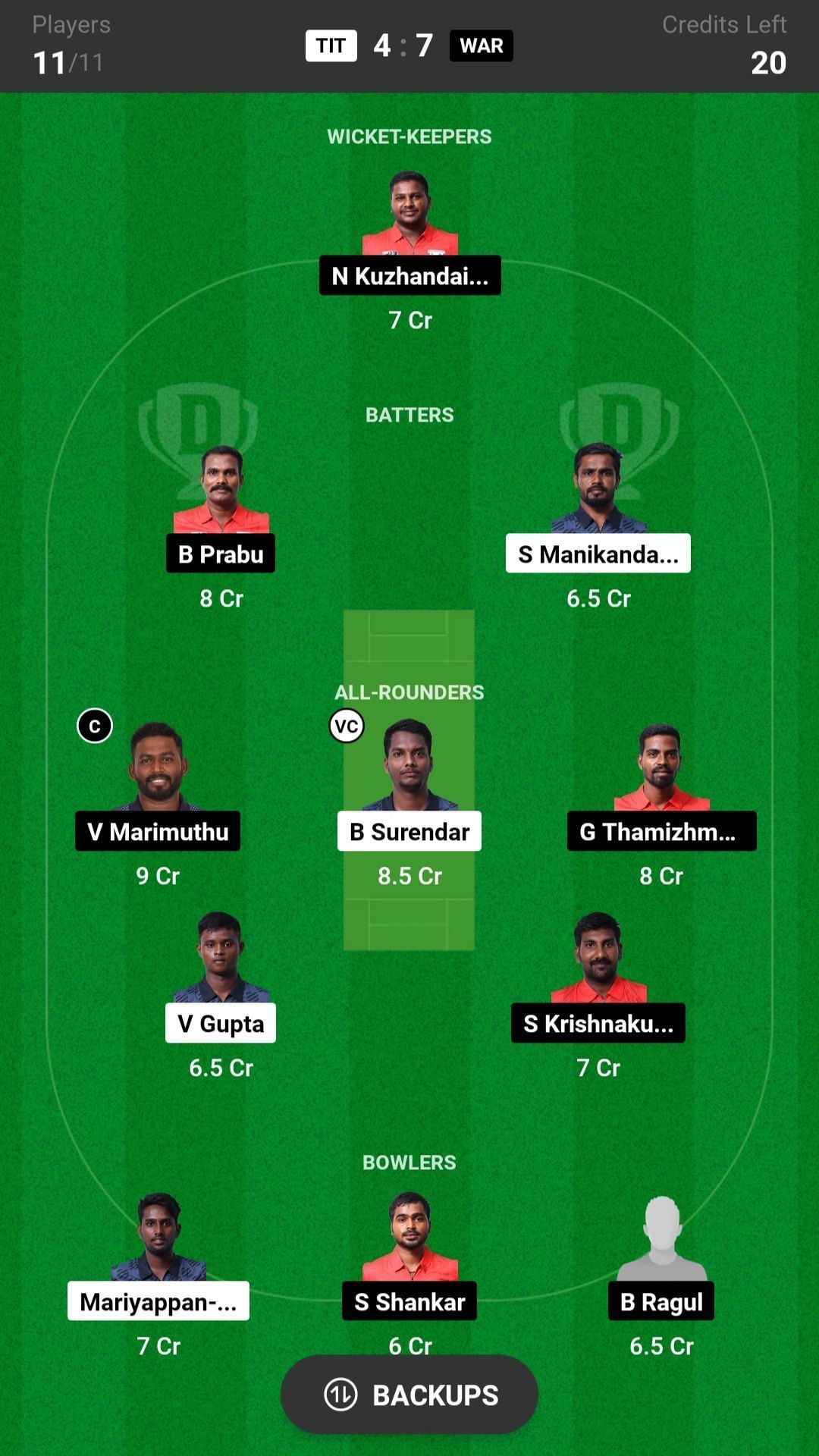 V Marimuthu and B Surendar are the best all-rounder picks for the Dream11 team as they are batting in the top order and also completing their quota of overs. S Krishnakumar is another good pick for today's Dream11 team.