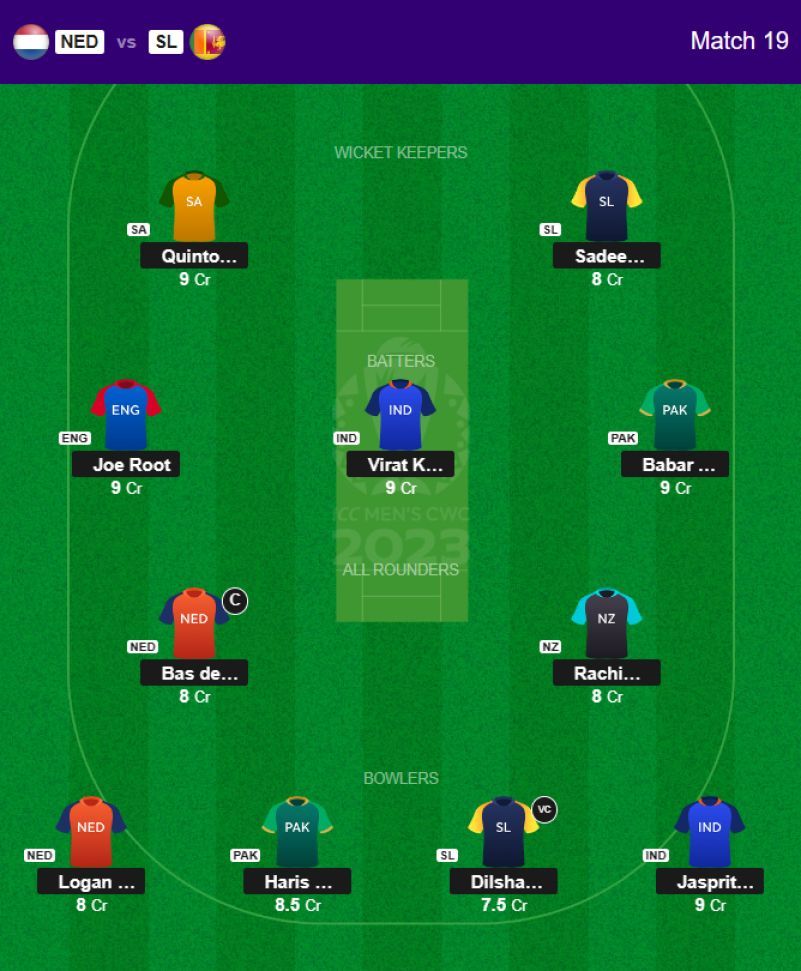 Players playing in Match 19: Bas de Leede (ALL) (NED), Sadeera Samarawickrama (WK) (SL), Dilshan Madushanka (BOWL) (SL), and Logan van Beek (BOWL) (NED).
