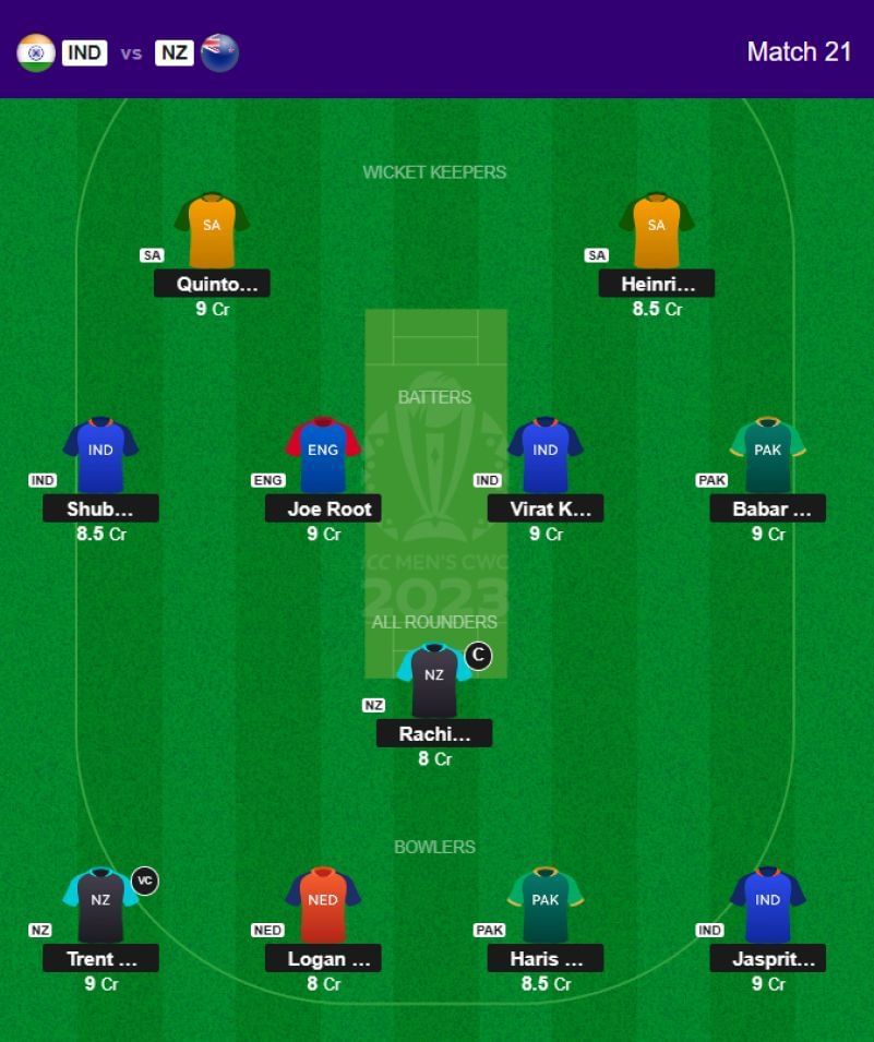 Players playing in Match 21: Jasprit Bumrah (BOWL) (IND), Virat Kohli (BAT) (IND), Rachin Ravindra (ALL) (NZ), Shubman Gill (BAT) (IND), and Trent Boult (BOWL) (NZ).