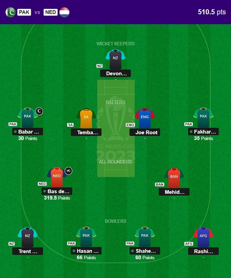 Captain: Babar Azam | Vice-captain: Bas de Leede