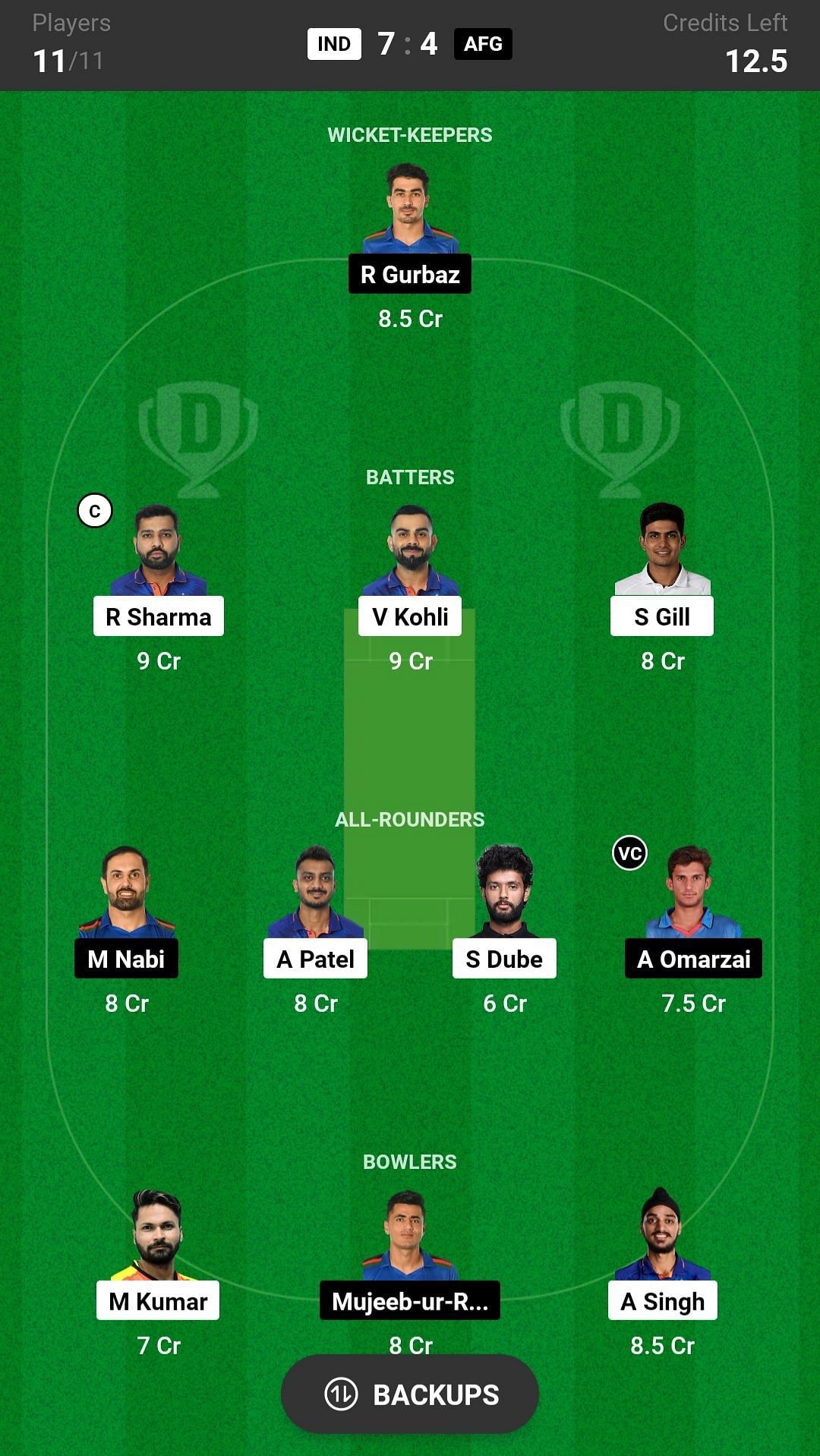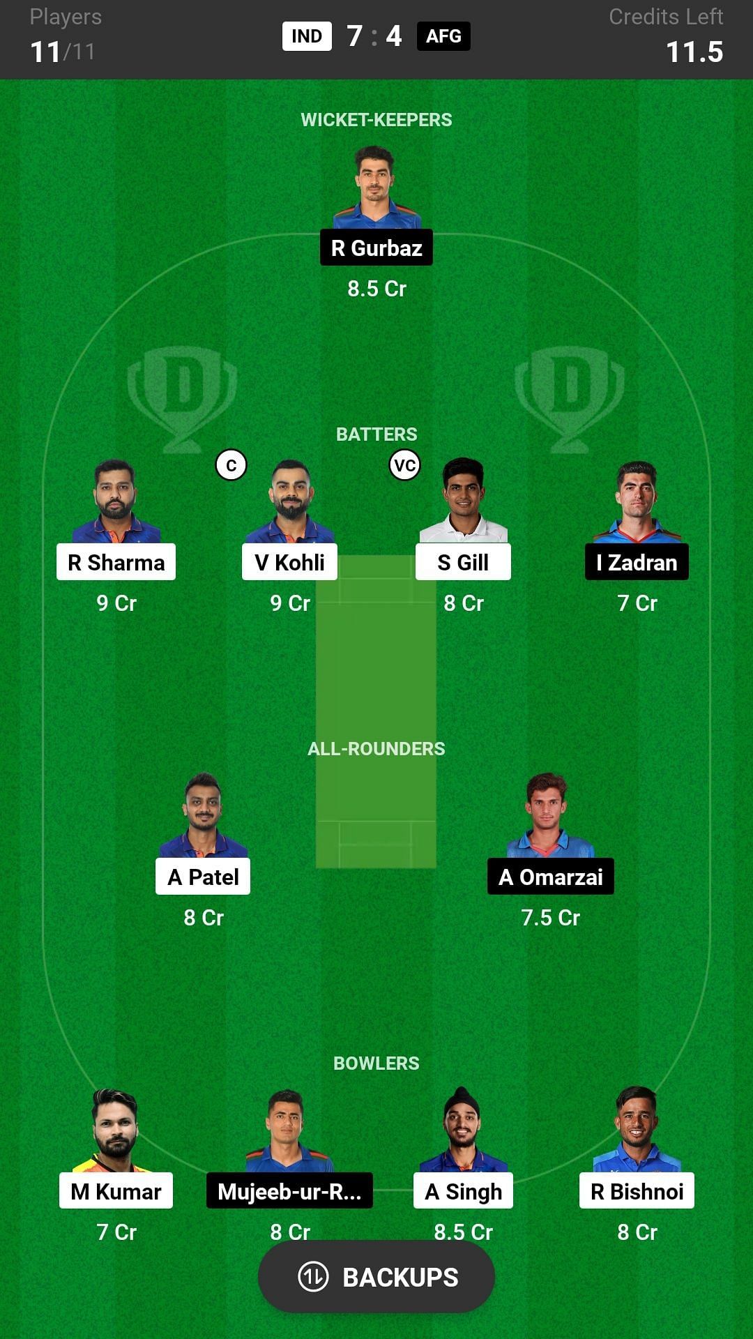 Batters: V Kohli, S Gill, R Sharma, I Zadran