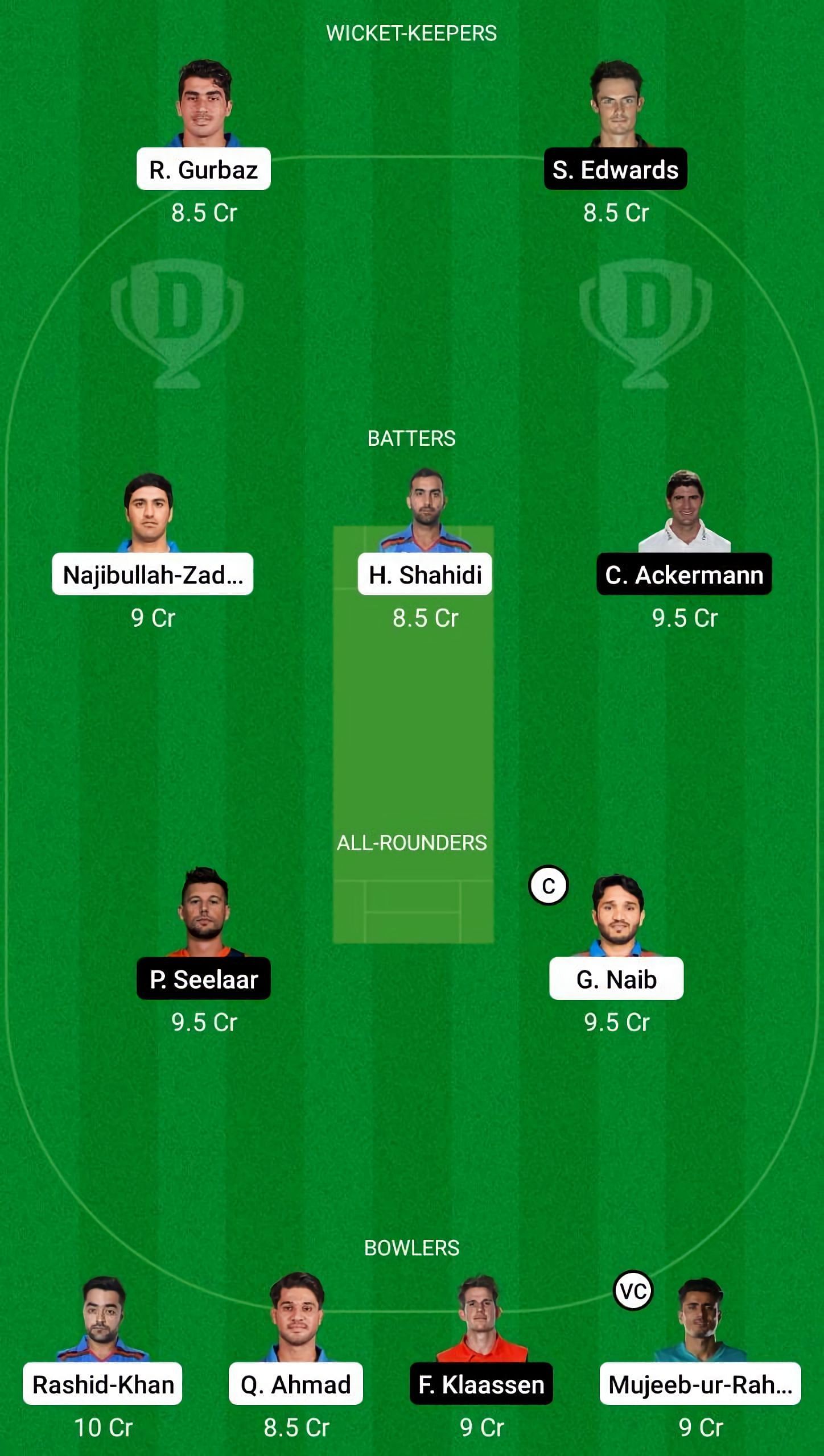 Fantasy Suggestion #2: Rahmanullah Gurbaz, Scott Edwards, Colin Ackermann, Hashmatullah Shahidi, Najibullah Zadran, Gulbadin Naib, Pieter Seelaar, Fred Klaassen, Mujeeb ur Rahman, Qais Ahmad, Rashid Khan