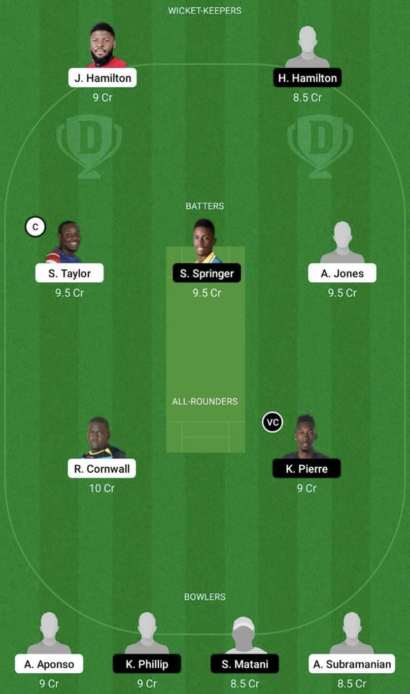 Steven Taylor, Rakheem Cornwall, Jahmar Hamilton (wk), Aaron Jones, Corne Dry, Nithil Reddy, Jay Pathak, Evroy Dyer, Amila Aponso, Zain Sayed, and Ateendra Subramanian.