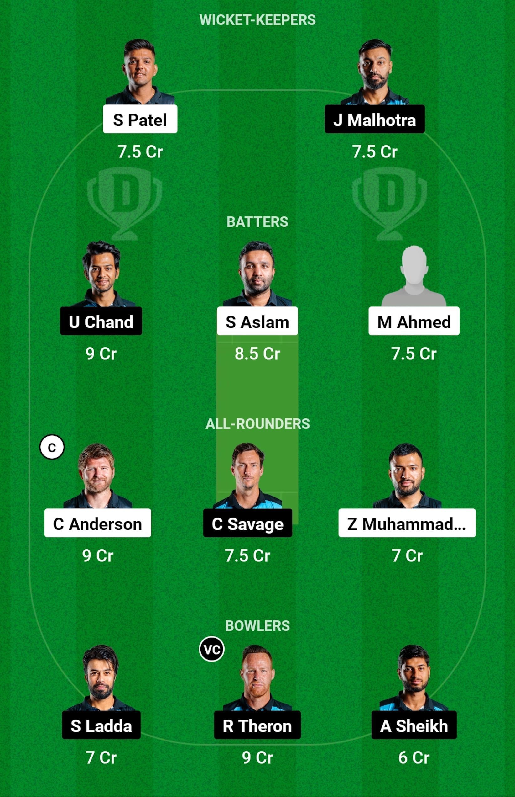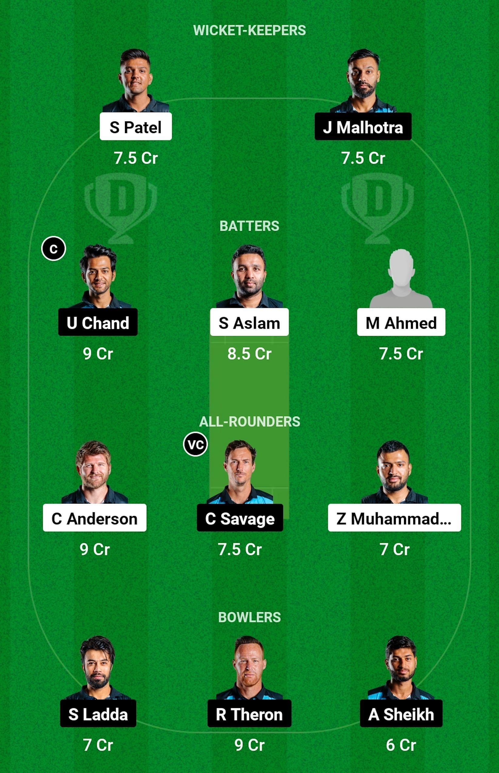 Smit Patel (wk), Sami Aslam (c), Zia Shahzad, Usman Rafiq, Bhaskar Yadram, Corey Anderson, Amila Aponso, Mukhtar Ahmed, Corne Dry, and Saif Badar.