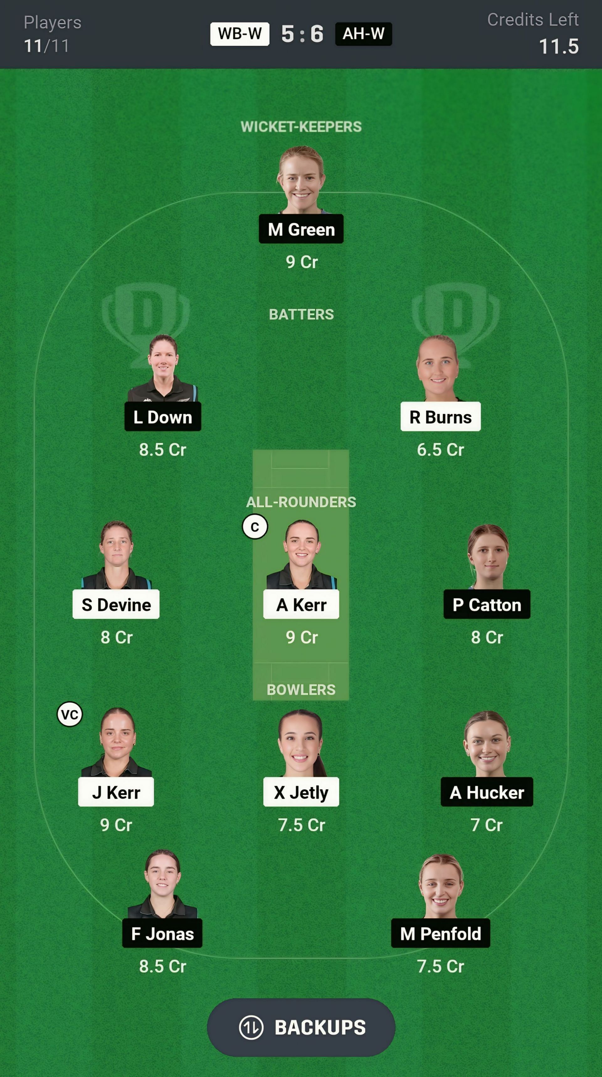 A Kerr is in top notch form and performing well in every match. She will bat in the top order and bowl a good number of overs, which makes him the top captaincy or vice-captaincy option for today's match. She has taken 7 wickets and smashed 171 runs in the last five matches.