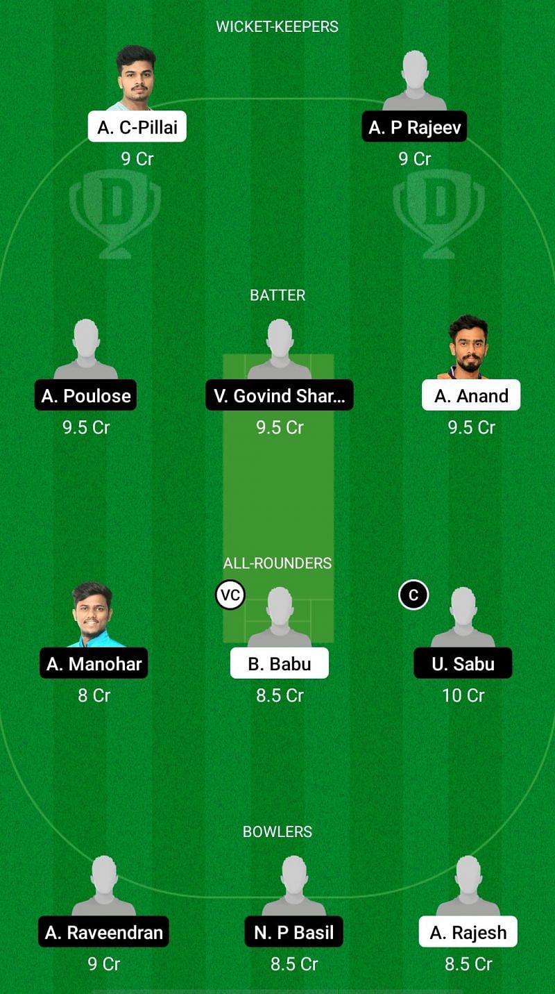 Fantasy Suggestion #1: Akash Pillai, Amal P Rajeev, Ashwin Anand, Vathsal Govind Sharma, Arun Poulose, Balu Babu, Unnimon Sabu, Akshay Manohar, Aravind Rajesh, N P Basil, Athul Raveendran.