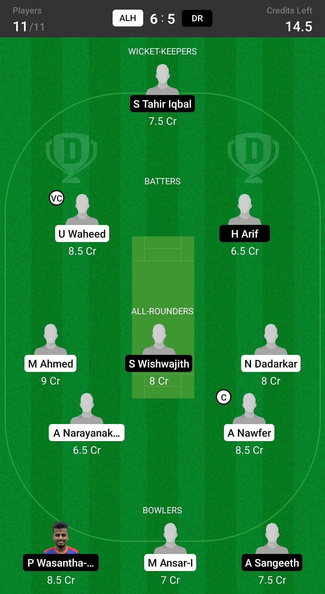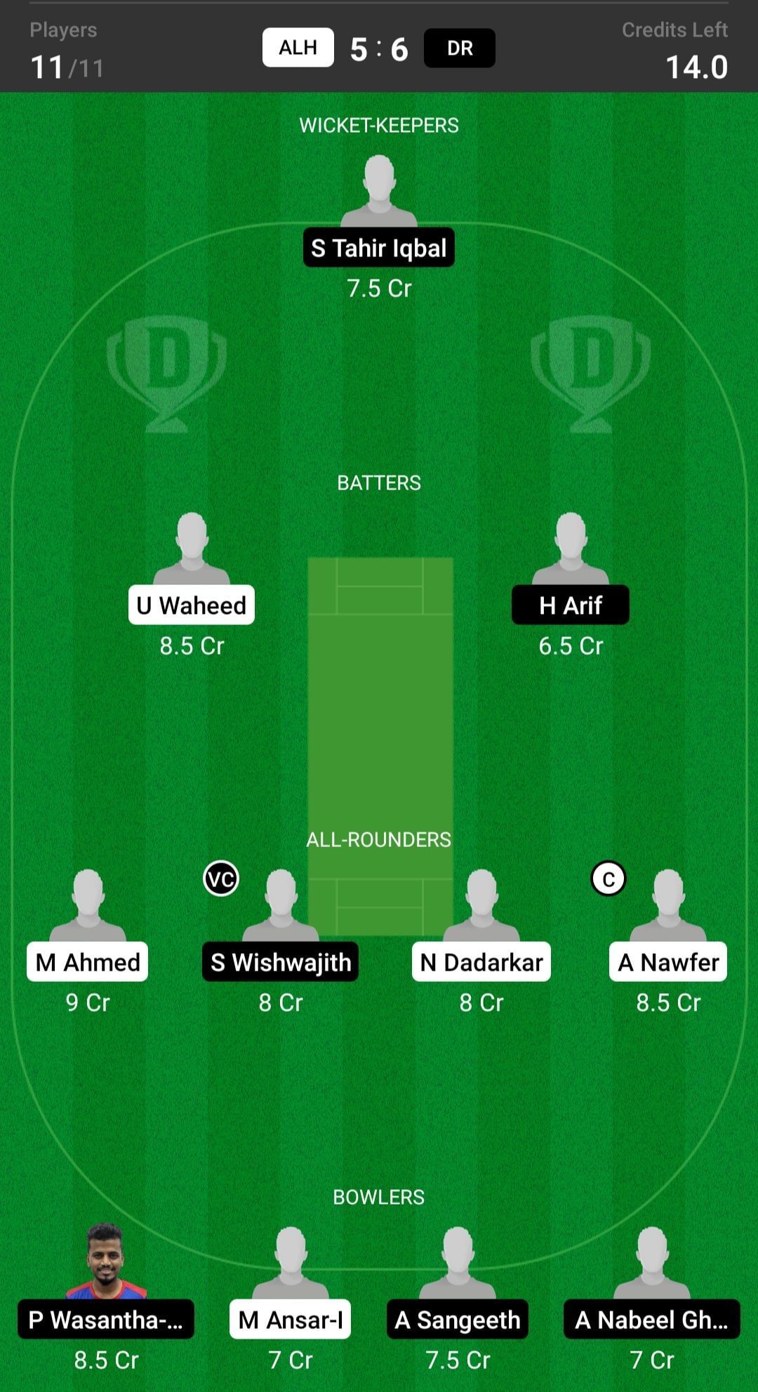 A Nawfer and S Wishwajith are the best all-rounder picks for the Dream11 team as they are batting in the top order and also completing their quota of overs. N Dadarkar is another good pick for today's Dream11 team.
