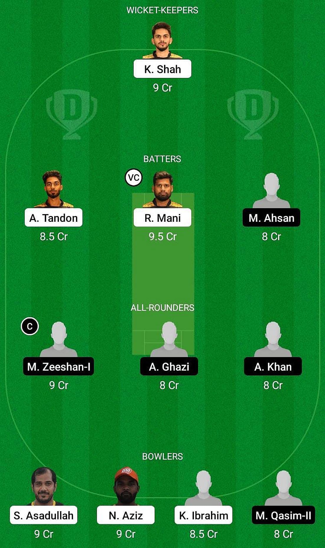 Captain: Malik Ahsan. Vice-captain: Khalid Shah
