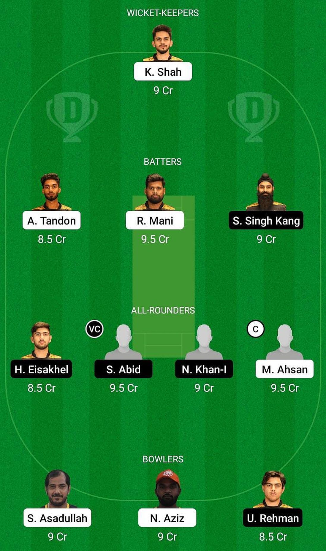 Fantasy Suggestion #2:Khalid Shah, Ansh Tondon, Renjith Mani, Simranjeet Singh, Hassan Eisakhel, Shoaib Abid, Nilansh Keswani, Malik Ahsan, Sharif Asadullah, Nasir Aziz, Unaib Rehman.