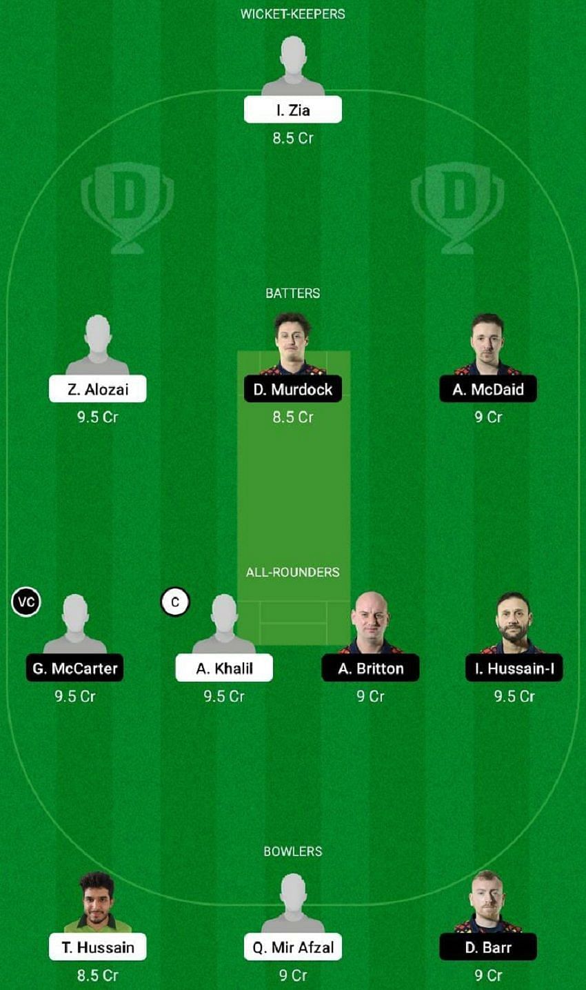 Fantasy Suggestion #1: I Zia, Z Alozai, S Ali, A McDaid, G McCarter, R Khan, A Khalil, I Hussain, T Hussain, L Momand and D Barr