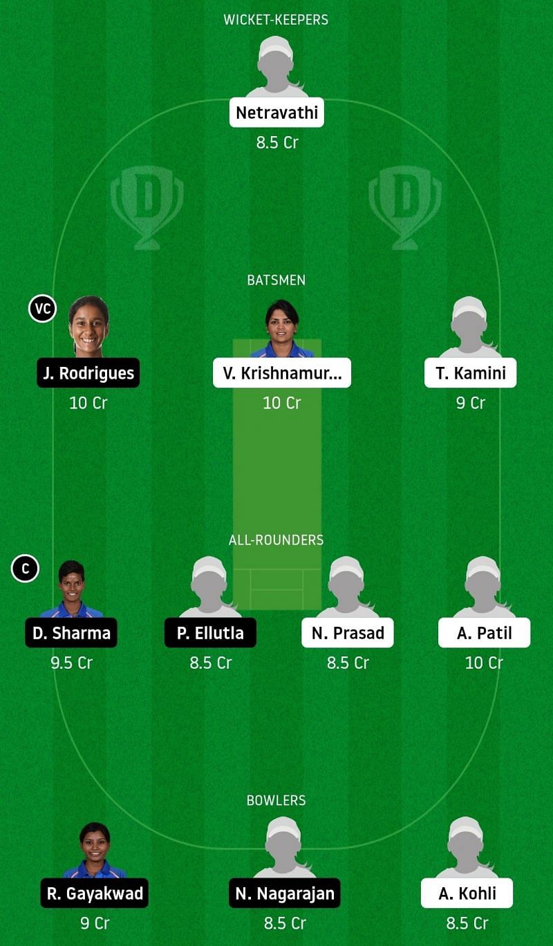 Fantasy Suggestion #1: Netravathi, Jemimah Rodrigues, Veda Krishnamurthy, Thirush Kamini, Deepti Sharma, Ellutla Padmaja, Nikki Prasad, Anuja Patil, Rajeshwari Gayakwad, Niranjana Nagarajan, Akanksha Kohli.