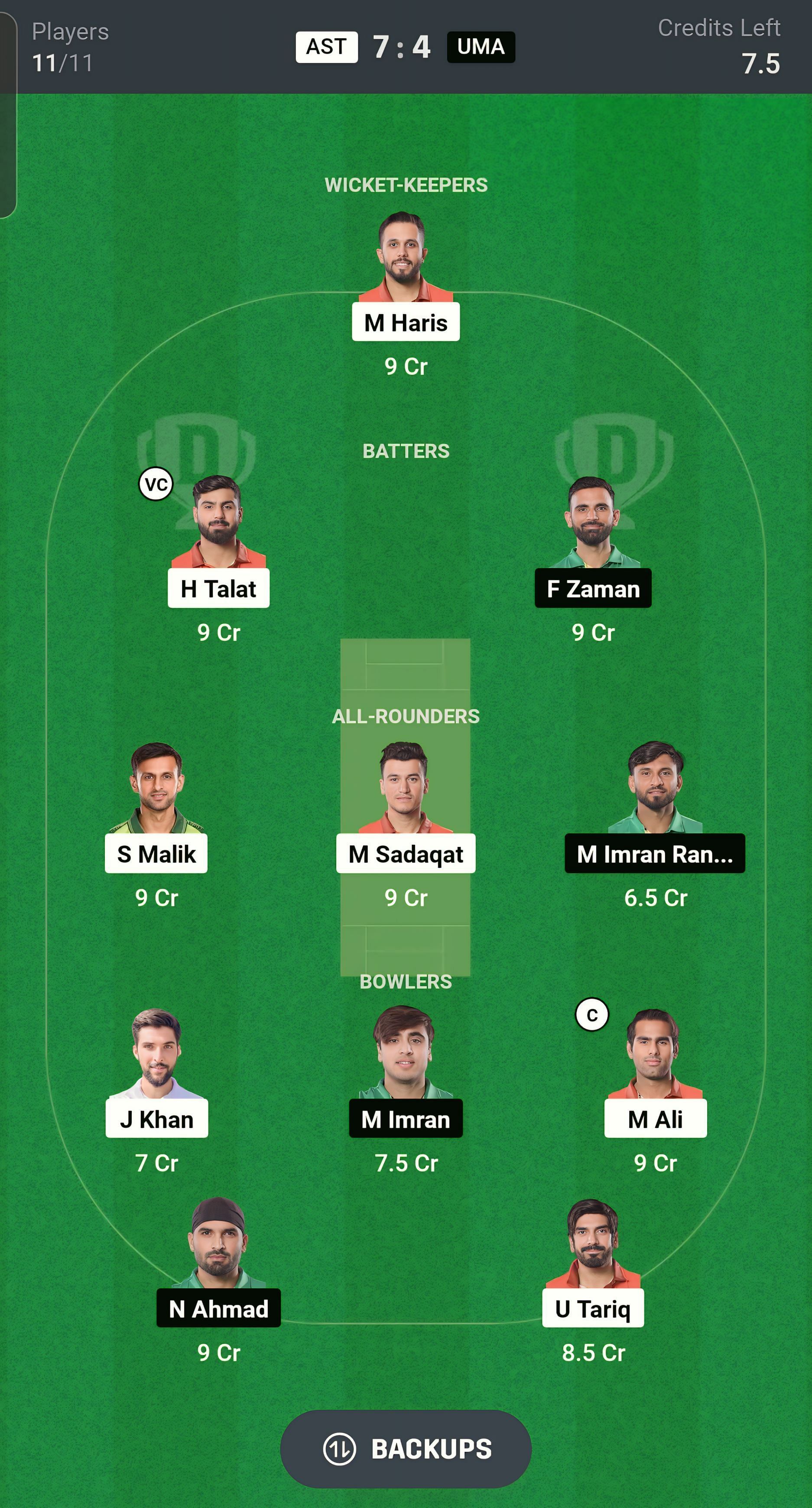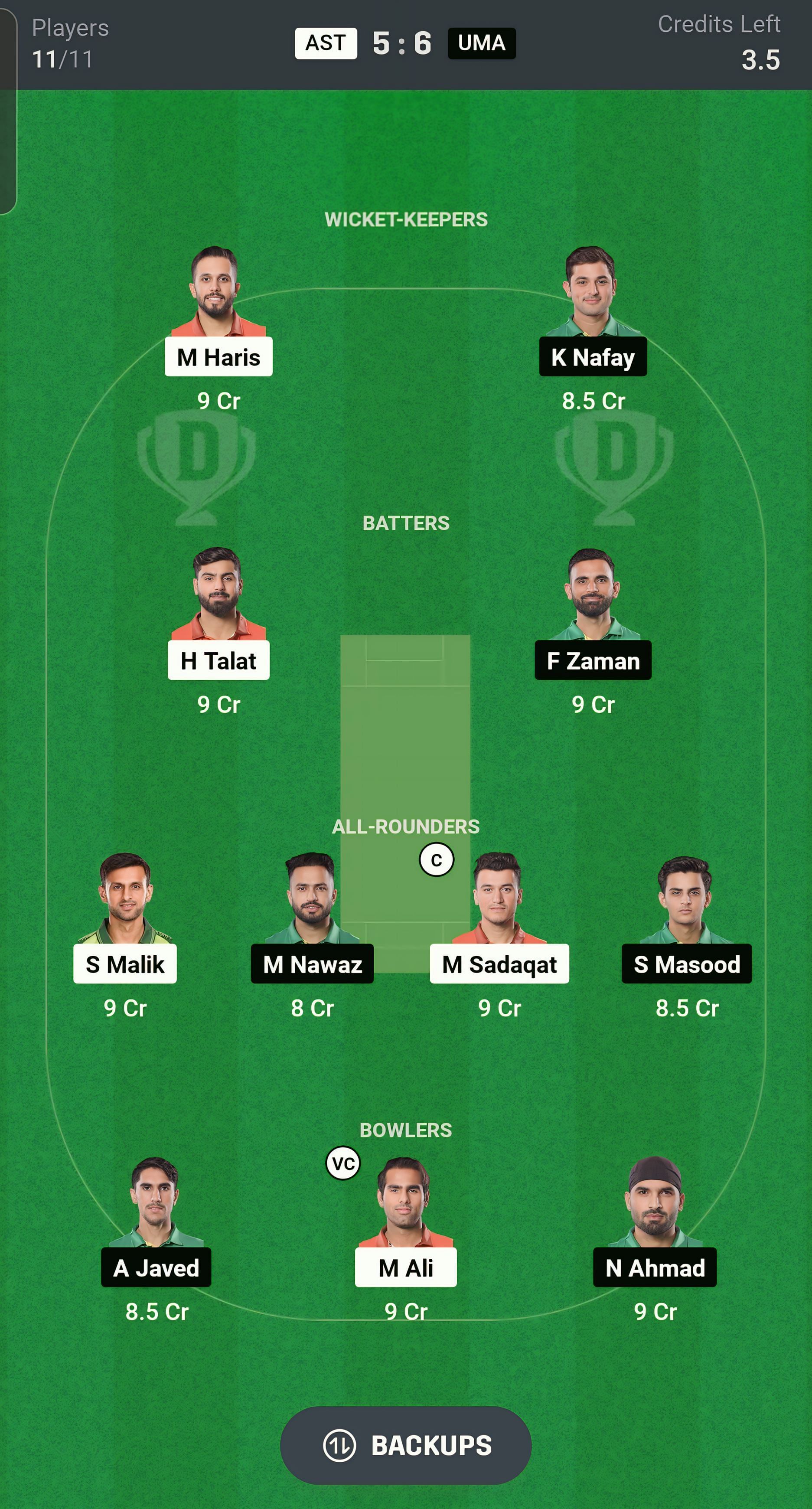 Mohammad Haris (wk & c), Taimur Khan, Mohammad Mohsin-ll, Yasir Khan, Hussain Talat, Maaz Sadaqat, Zaman Khan, Mohammad Ali, Tahir Hussain, Usman Tariq, Shoaib Malik