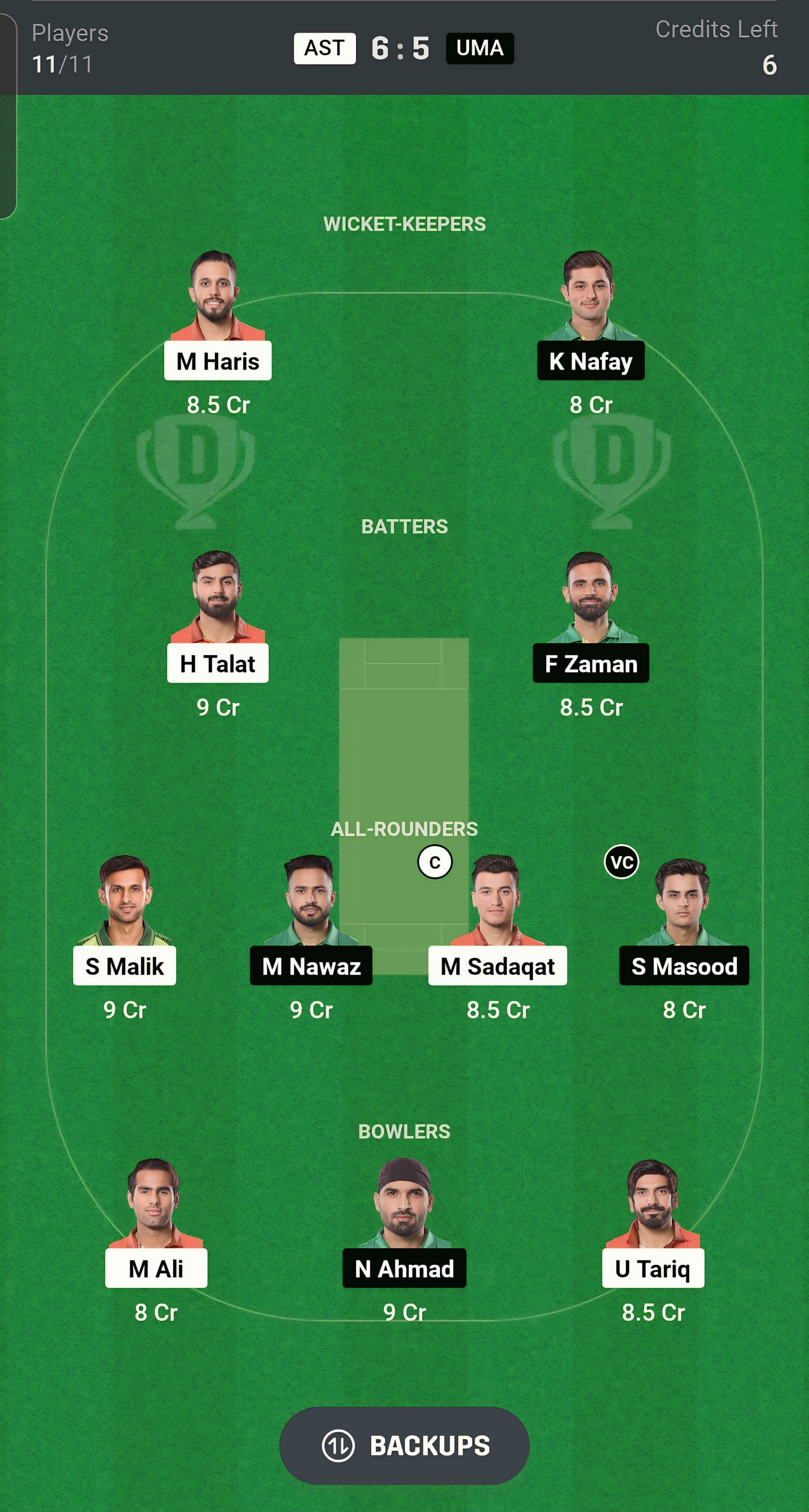 Mohammad Haris (wk & c), Taimur Khan, Mohammad Mohsin-ll, Yasir Khan, Hussain Talat, Maaz Sadaqat, Zaman Khan, Mohammad Ali, Tahir Hussain, Usman Tariq, Shoaib Malik