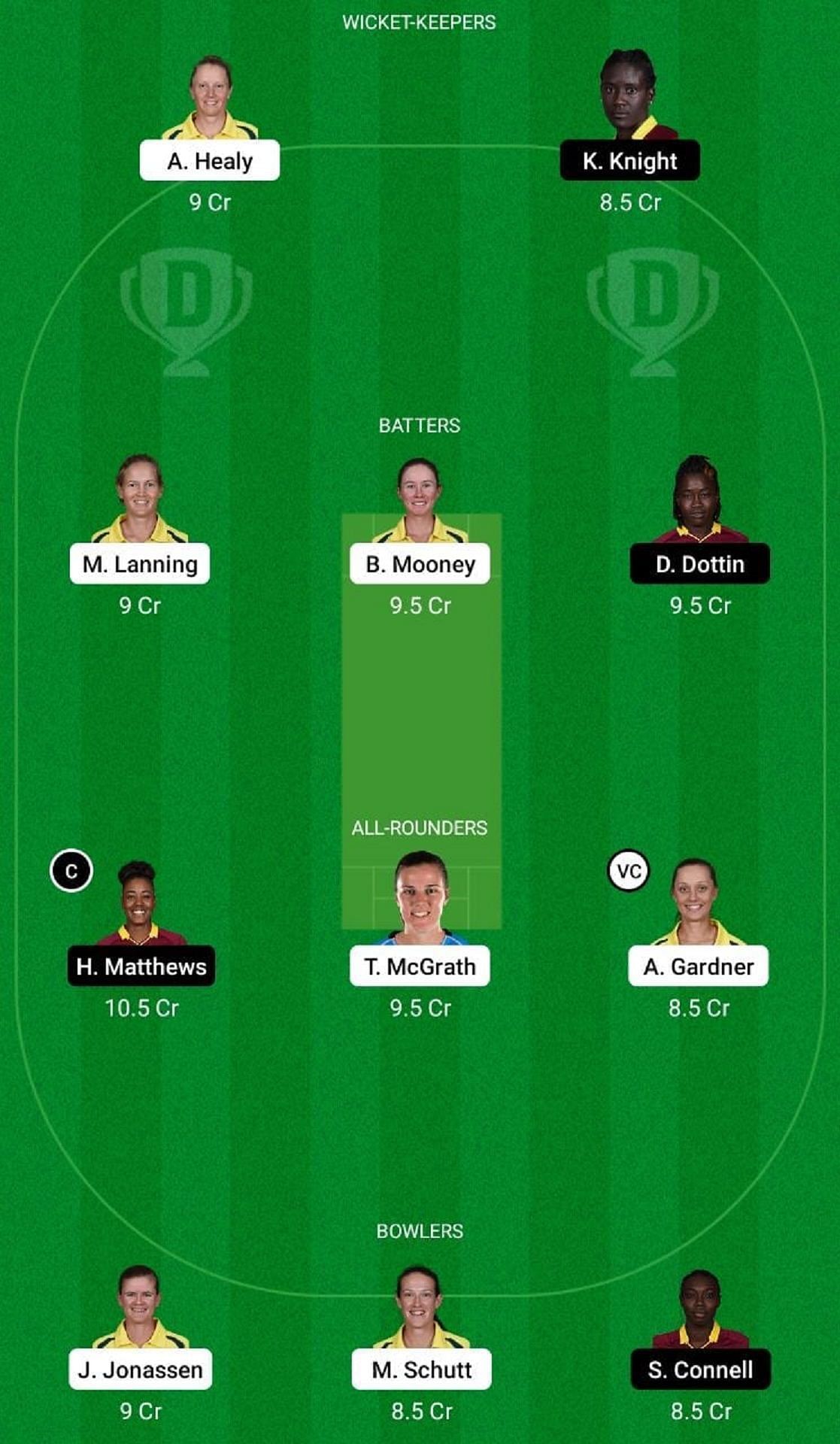 Fantasy Suggestion #1: Kycia Knight, Alyssa Healy, Deandra Dottin, Beth Mooney, Meg Lanning, Hayley Matthews, Ashleigh Gardner, Tahlia McGrath, Jess Jonassen, Megan Schutt, Shamilia Connell