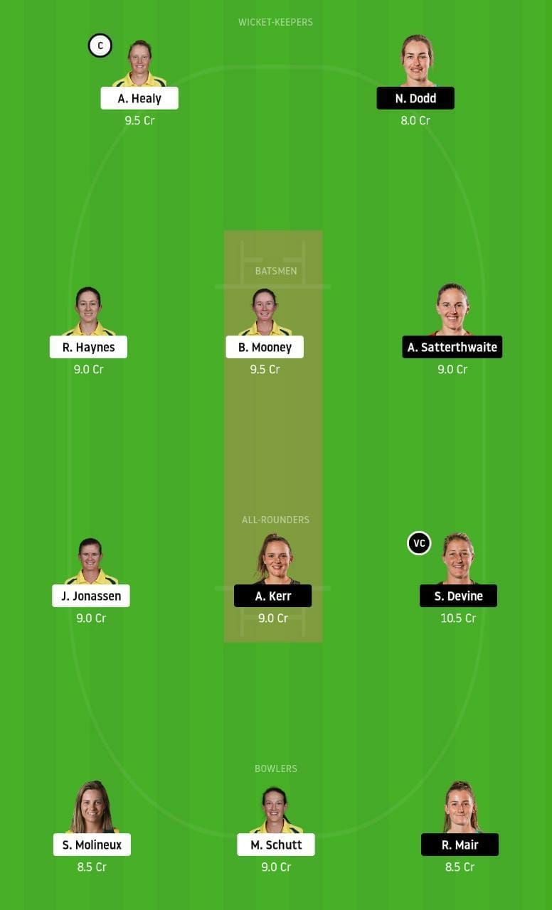 Fantasy Suggestion #1: Alyssa Healy, Natalie Dodd, Rachael Haynes, Beth Mooney, Amy Satterthwaite, Jess Jonassen, Amelia Kerr, Sophie Devine, Sophie Molineux, Megan Schutt and Rosemary Mair