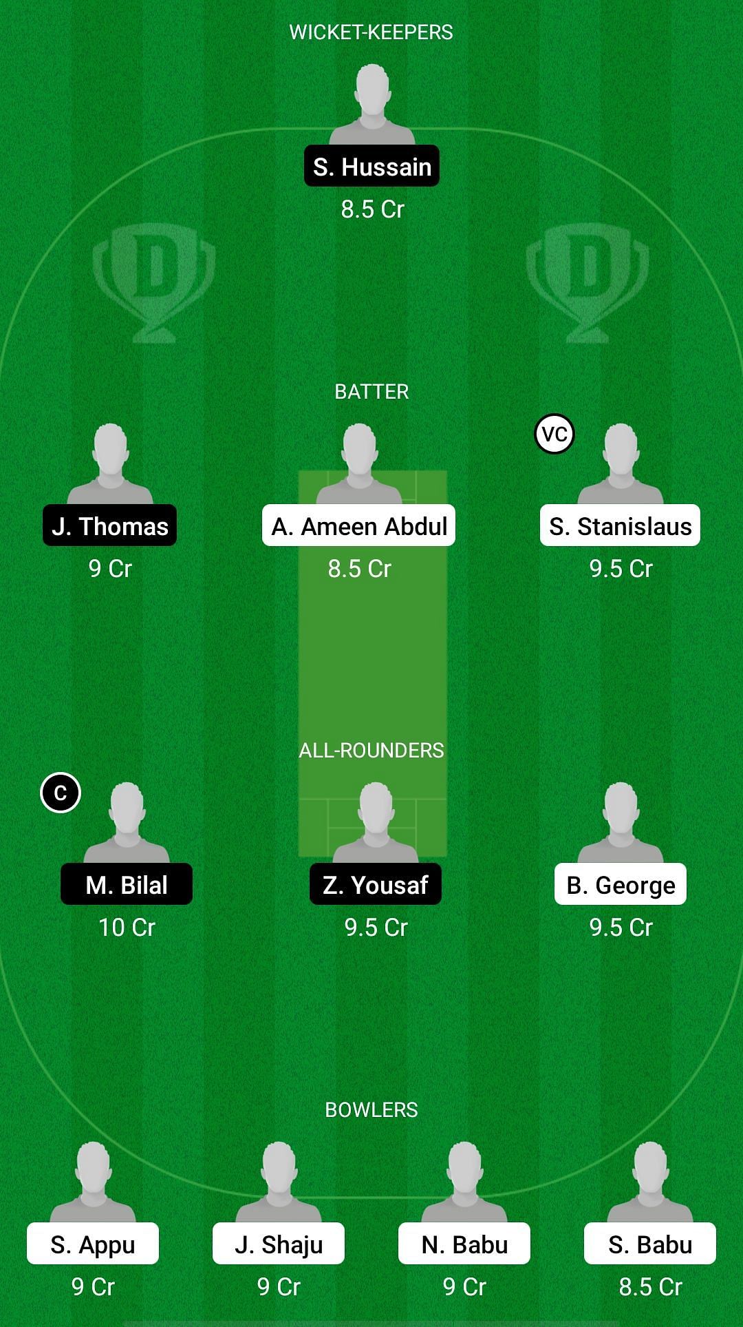 Fantasy Suggestion #2: Avinash Dileep, Jojo Thomas, Al Ameen Abdul, Samuel Stanislaus, Bilal Khan, Zeshan Yousaf, Niyas Pullariyil, Jani Kanakbhai, Justin Shaju, Nithin Babu, Sarath Babu.
