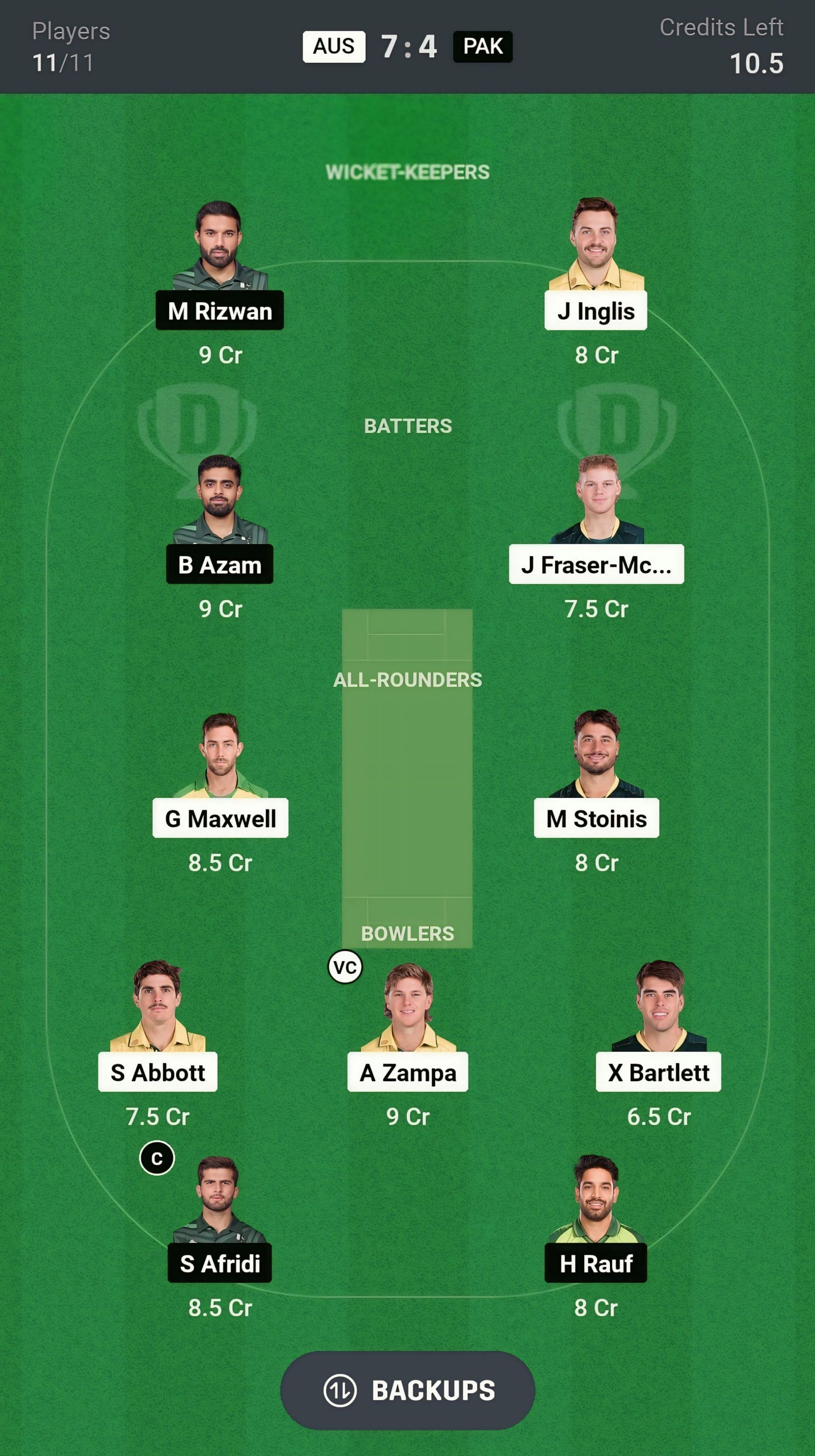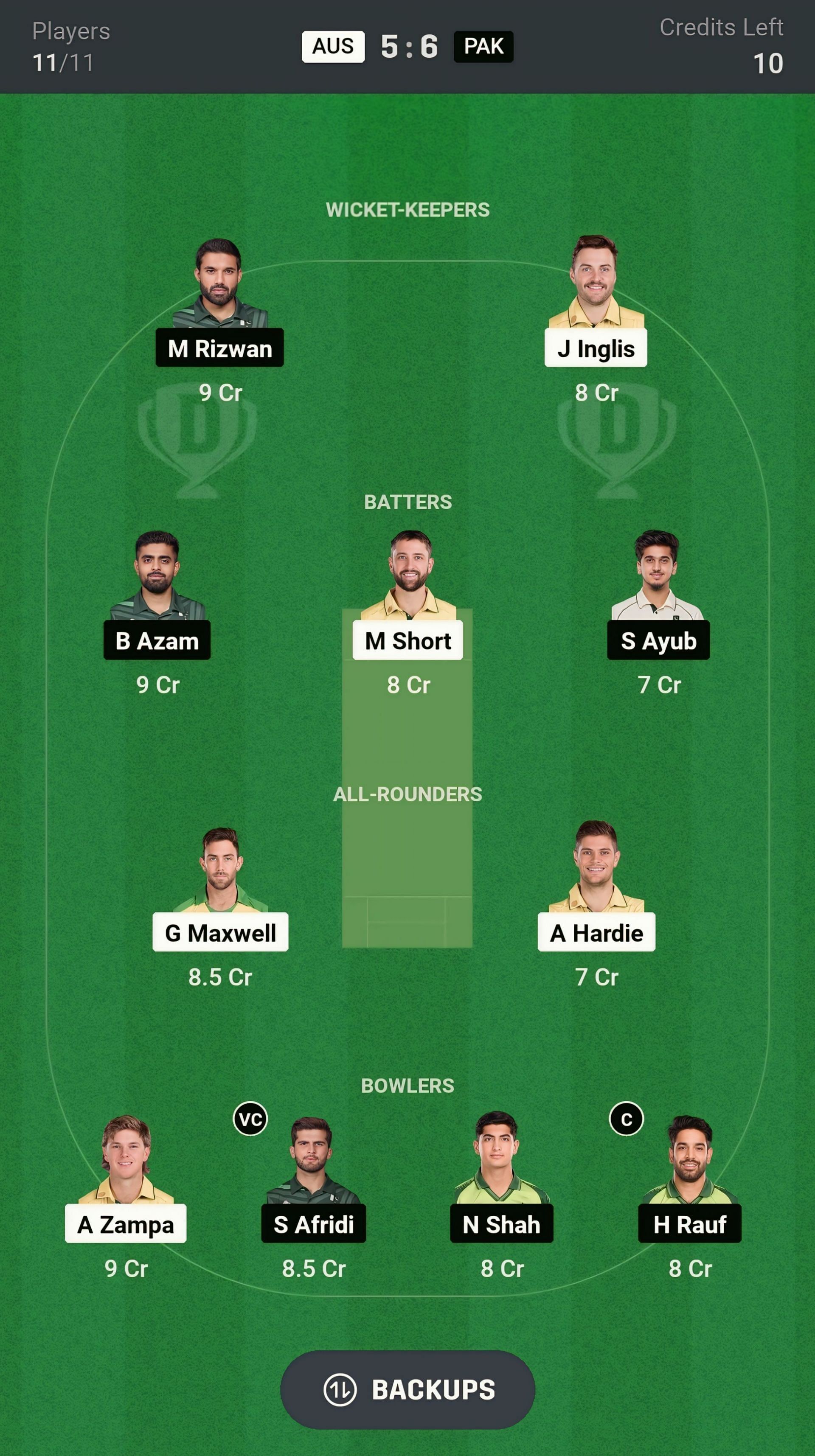 Bowlers: S Afridi, A Zampa, H Rauf, N Shah