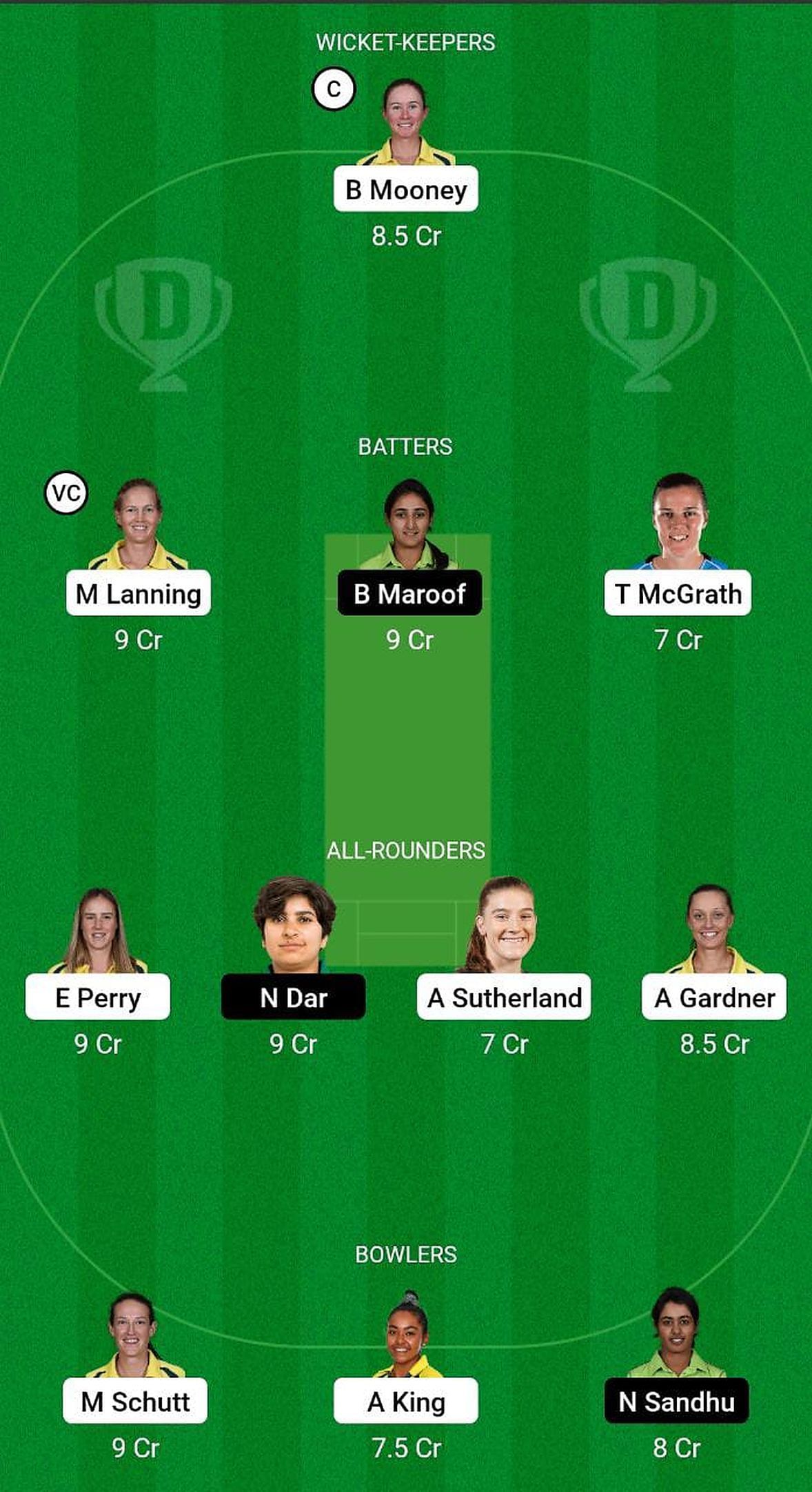 Beth Mooney (wk), Meg Lanning (c), Ellyse Perry, Tahlia McGrath, Ashleigh Gardner, Annabel Sutherland, Jess Jonassen, Alana King, Kim Garth, Megan Schutt, Nicola Carey.