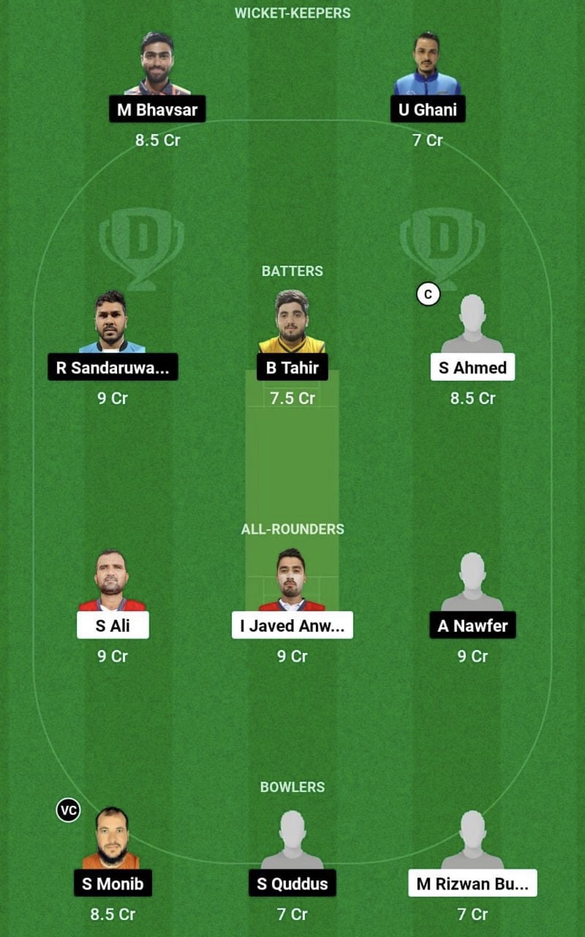 Meet Bhavsar, Ravija Sandaruwan, Adnan Idrees, Usman Patel (wk), Ali Zaheer, Mohammed Aslam (c), Shiraz Khan, Bilal Tahir, Sayed Monib, Mohamed Shafeeq, and Shahrukh Quddus