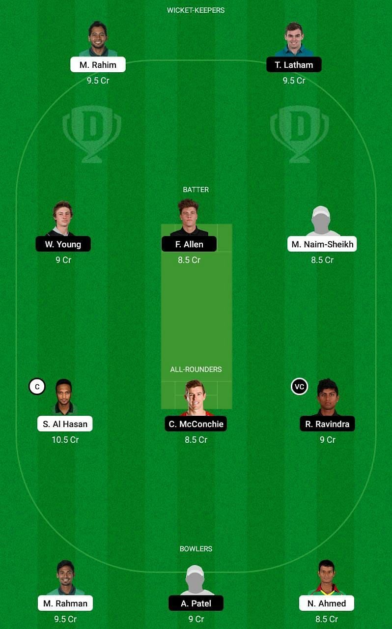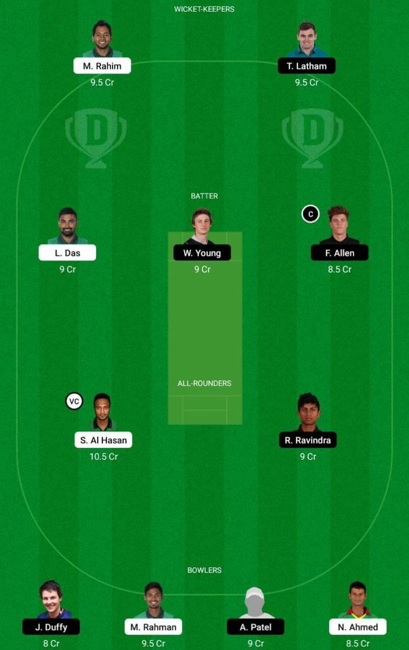Fantasy Suggestion #1: Tom Latham, Mushfiqur Rahim, Liton Das, Will Young, Finn Allen, Rachin Ravindra, Shakib Al Hasan, Ajaz Patel, Mustafizur Rahman, Nasum Ahmed and Jacob Duffy