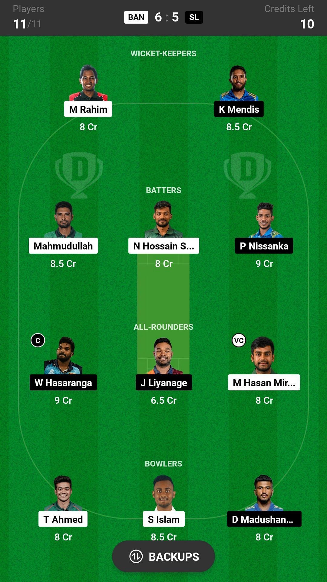 M Hasan Miraz and W Hasaranga are the best all-rounder picks for the Dream11 team as they are batting in the middle order and will also bowl a lot of overs. J Liyanage is another good pick for today's nail-biting match.