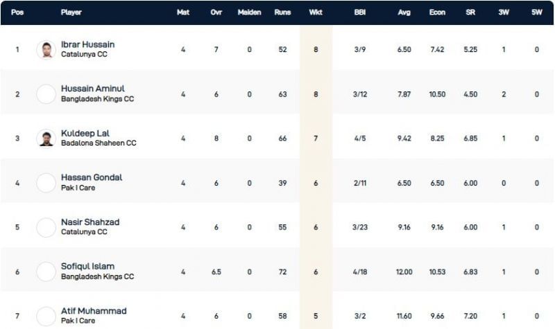 Ibrar Hussain of Catalunya CC and Hussain Aminul of Bangladesh Kings CC are the joint-highest wicket-takers after Day 3 of the Barcelona T10 League 2020. Both the bowlers have accounted for 8 wickets apiece, with the former placed at the top of the chart due to his much better economy rate.