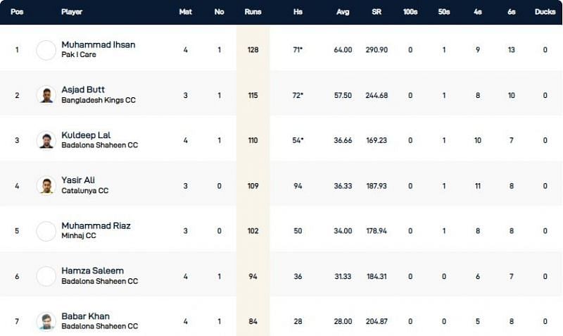 Asjad Butt of Bangladesh Kings CC occupies the second spot in the list of highest run-scorers with 115 runs to his name. He has an unbeaten 72 as his highest score. Butt has scored his runs at an excellent strike rate of 244.68 and has struck 8 fours apart from 10 hits over the rope.