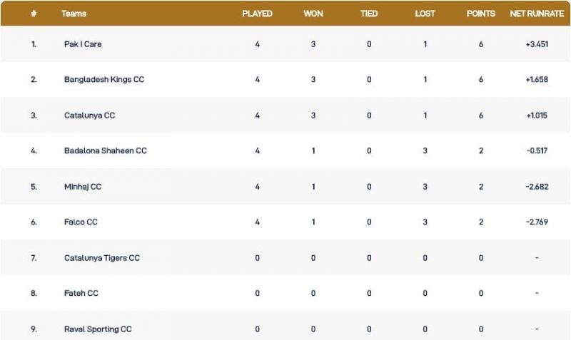 Pak I Care, Bangladesh Kings CC and Catalunya CC occupy the top three spots in the Barcelona T10 League 2020 points table with 6 points apiece in their respective kitties. The three teams have lost just one out of the four encounters each they have played and are placed in that order based on their net run rates.