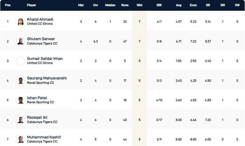 Khalid Ahmadi of United CC Girona and Ghulam Sarwar of Catalunya Tigers CC, with 7 wickets each, are the highest wicket-takers after Day 5 of the Barcelona T10 League 2020. The former is placed higher due to his better economy rate.
