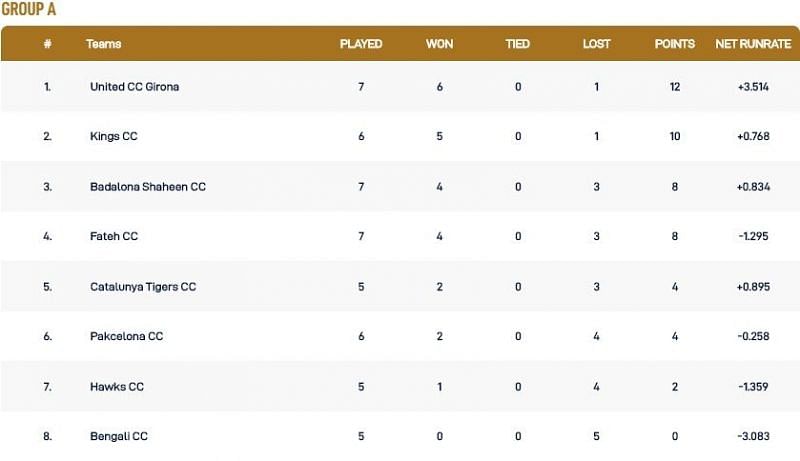 United CC Girona sit atop the Group A points table of the Barcelona T10 League 2020 with 12 points in their kitty. They have completed their group stage engagements with wins in six of their seven encounters.