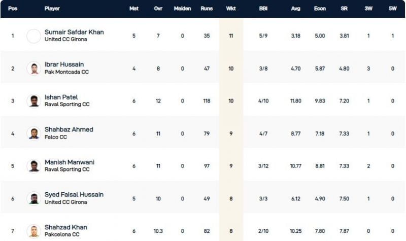 Sumair Safdar Khan of United CC Girona is the highest wicket-taker after Day 11 of the Barcelona T10 League 2020, with 11 scalps to his credit. His spell of 5/9 is the only five-wicket haul of the tournament thus far and he also has an exceptional economy rate of 5.00.