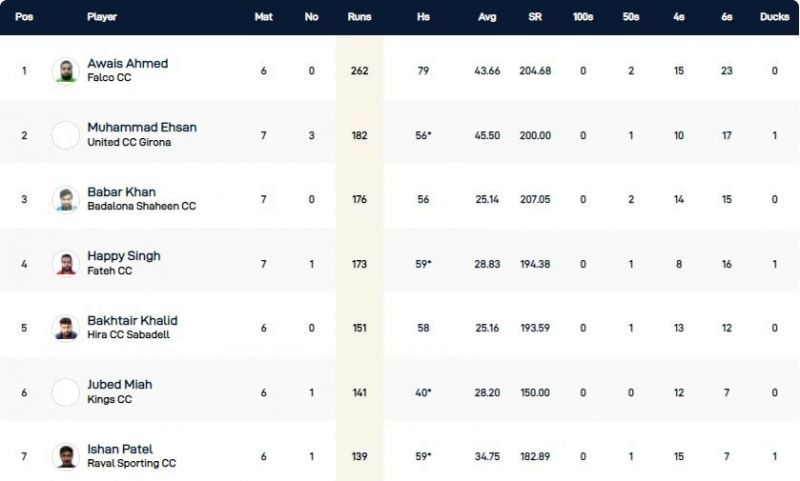 Muhammad Ehsan of United CC Girona occupies the second spot in the list of highest run-getters, with 182 runs to his name. He has an unbeaten 56 as his highest score. Ehsan also has an impressive strike rate of 200.00, and has struck 10 fours apart from 17 hits over the rope.