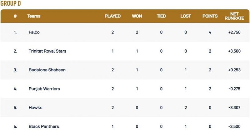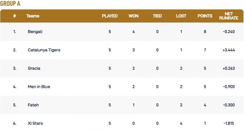 Trinitat Royal Stars, Badalona Shaheen, and Punjab Warriors have two points apiece in their respective kitties. While Trinitat Royal Stars emerged victorious in the only match they played on Tuesday, the latter two teams suffered defeats against Falco.
