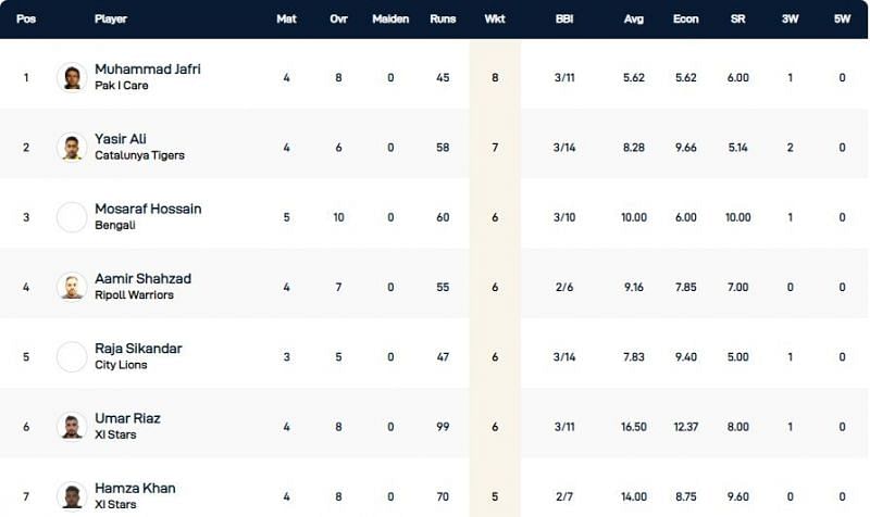 Yasir Ali of Catalunya Tigers is placed second in the wicket-taking charts, with seven scalps to his name. He has a best effort of 3/14 but has been on the expensive side as he has conceded an average of 9.66 runs per over.