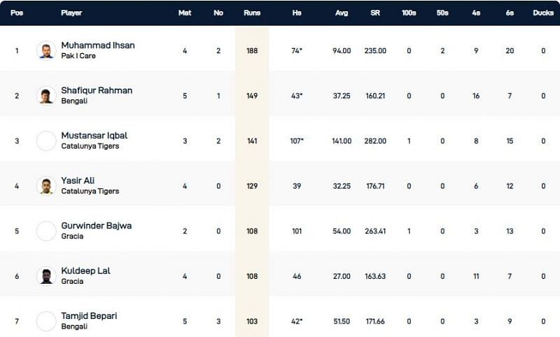 Muhammad Ihsan of Pak I Care is the highest run-scorer after the seventh day of action in the Barcelona T10 League 2021.