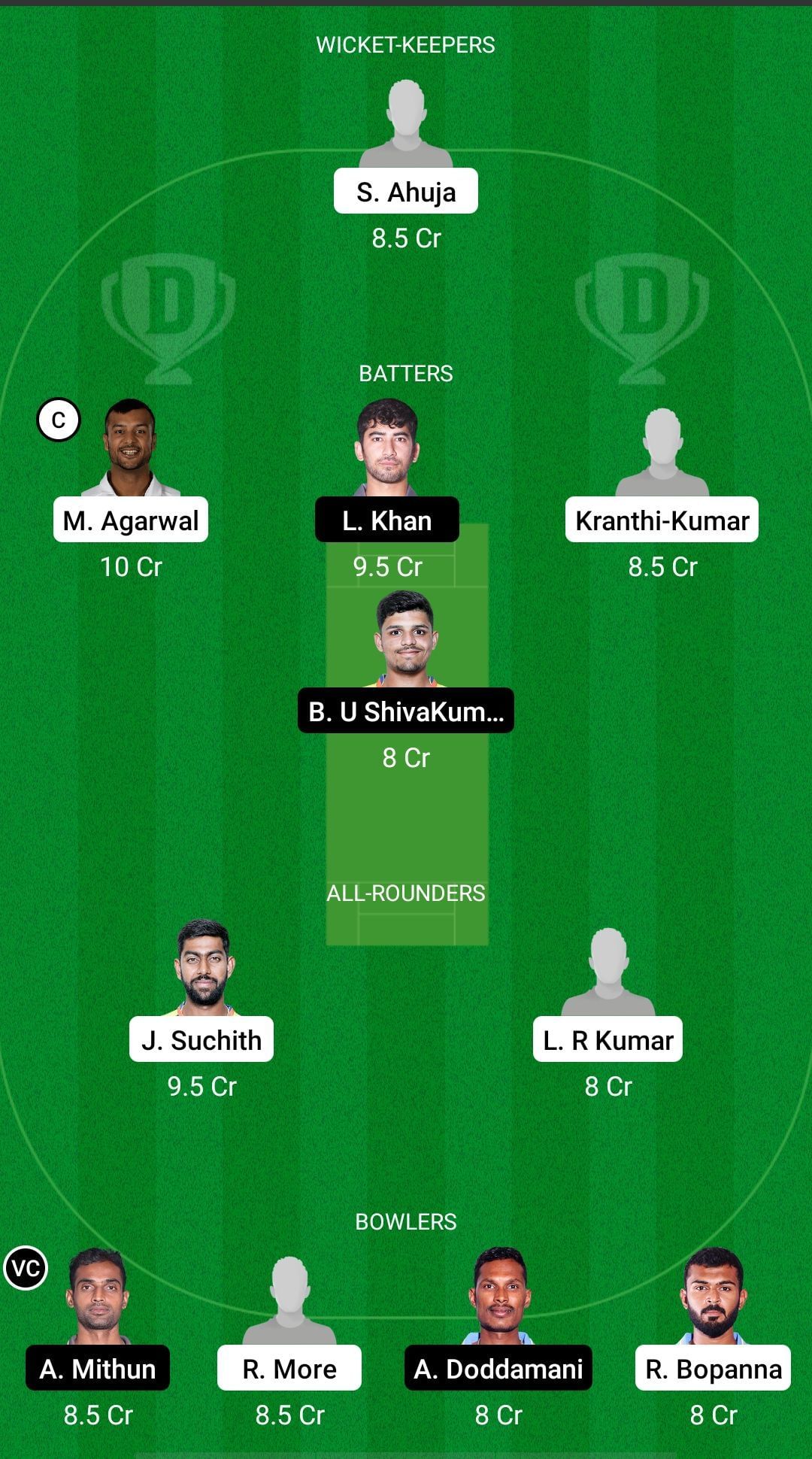 Fantasy Suggestion #2: Suraj Ahuja, Mayank Agarwal, Kranthi Kumar, Liyan Khan, BU Shiva Kumar, Kumar LR, Jagadeesha Suchith, Rishi Bopanna, Ronit More, Abhimanyu Mithun, Anand Doddamani.