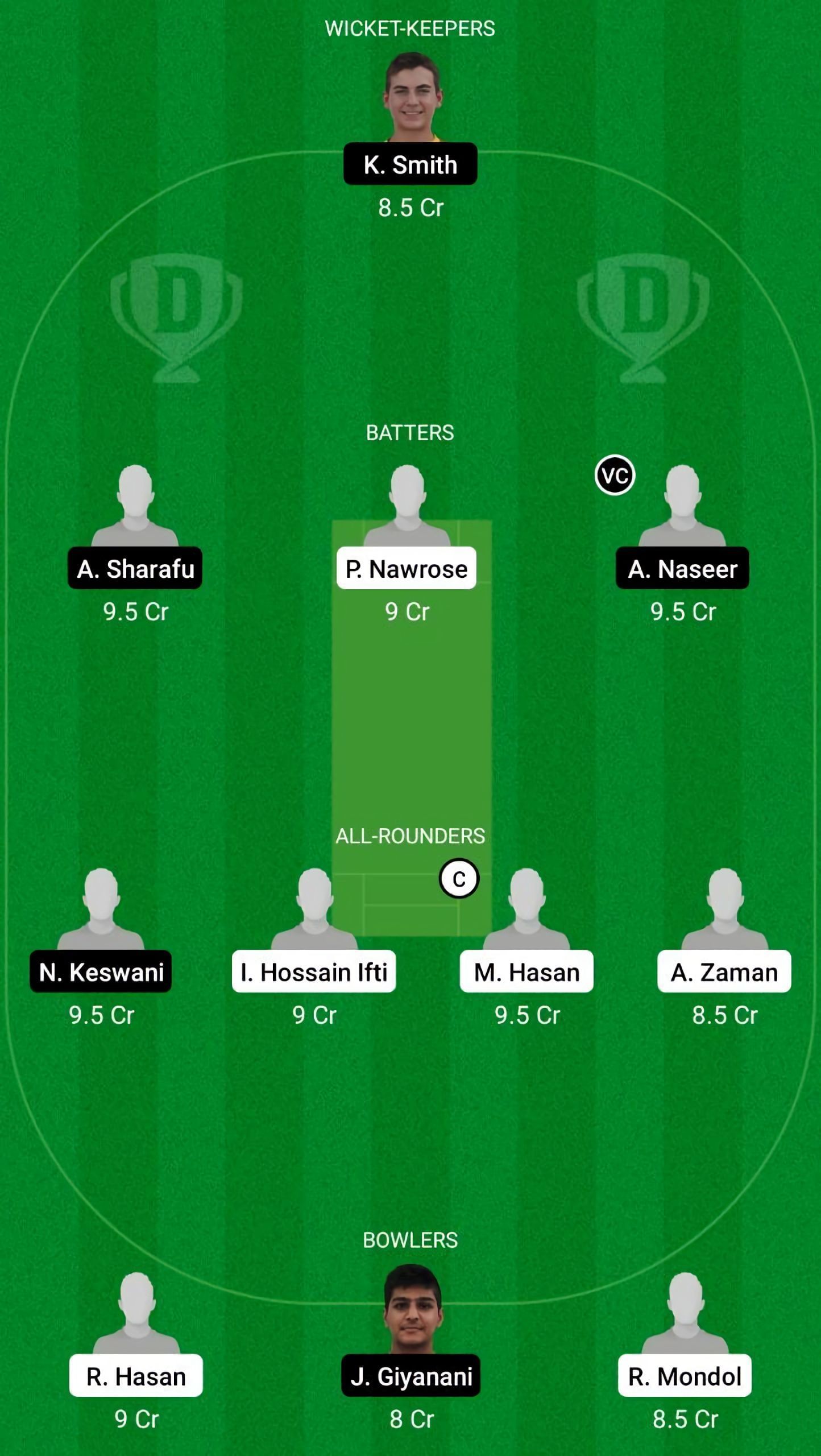 Fantasy Suggestion #1: K Smith, A Naseer, A Sharafu, P Nawrose, M Hasan, N Keswani, A Zaman, I Hossain Ifti, R Mondol, J Giyanani, R Hasan