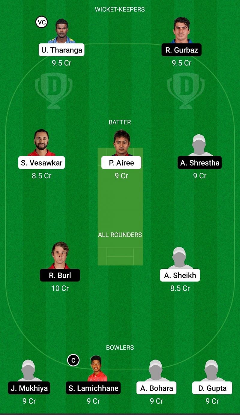 Fantasy Suggestion #2: Upul Tharanga, Rahmanullah Gurbaz, Sharad Vesawkar, Pradeep Airee, Amit Shrestha, Ryan Burl, Aarif Sheikh, Jitendra Mukhiya, Sandeep Lamichhane, Abinash Bohara, Durgesh Gupta