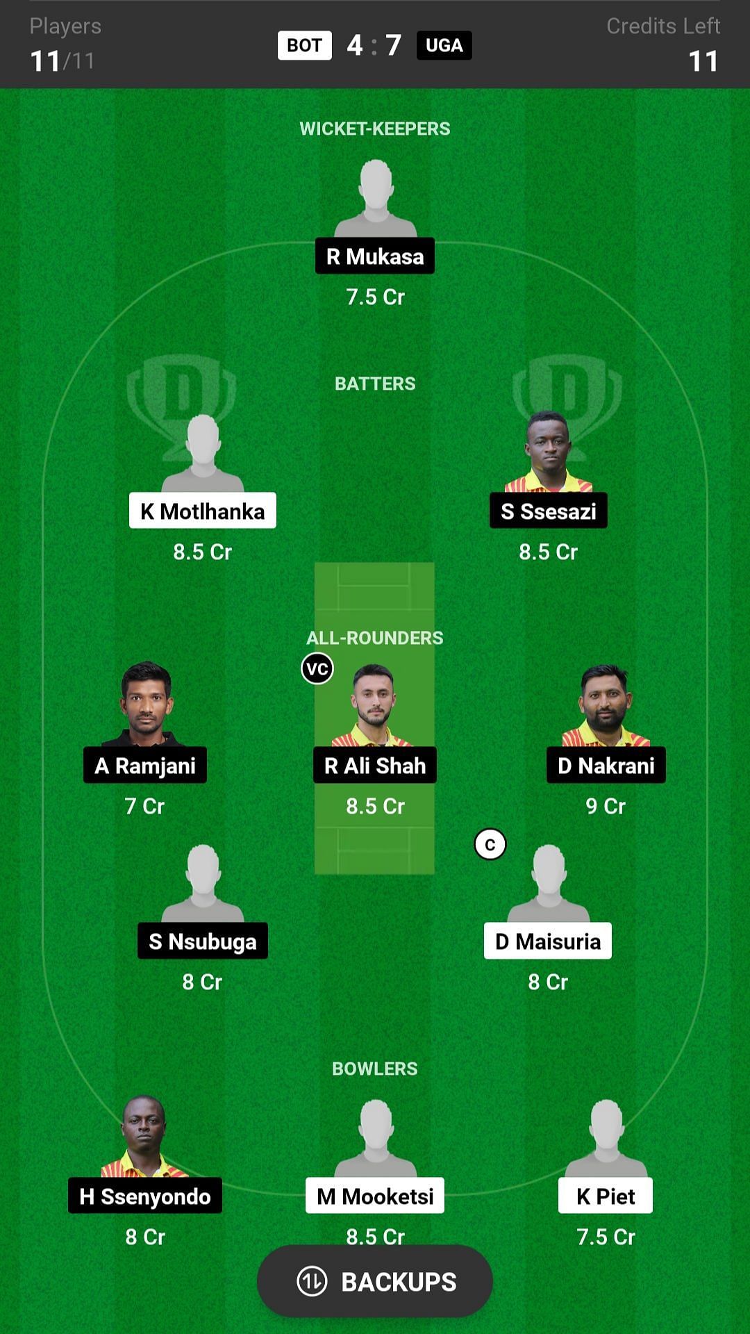 S Ssesazi and K Motlhanka are the two best batsmen picks for the Dream11 team. R Obuyo played exceptionally well in the last series, so he is also a good pick for today's Dream11 fantasy team.