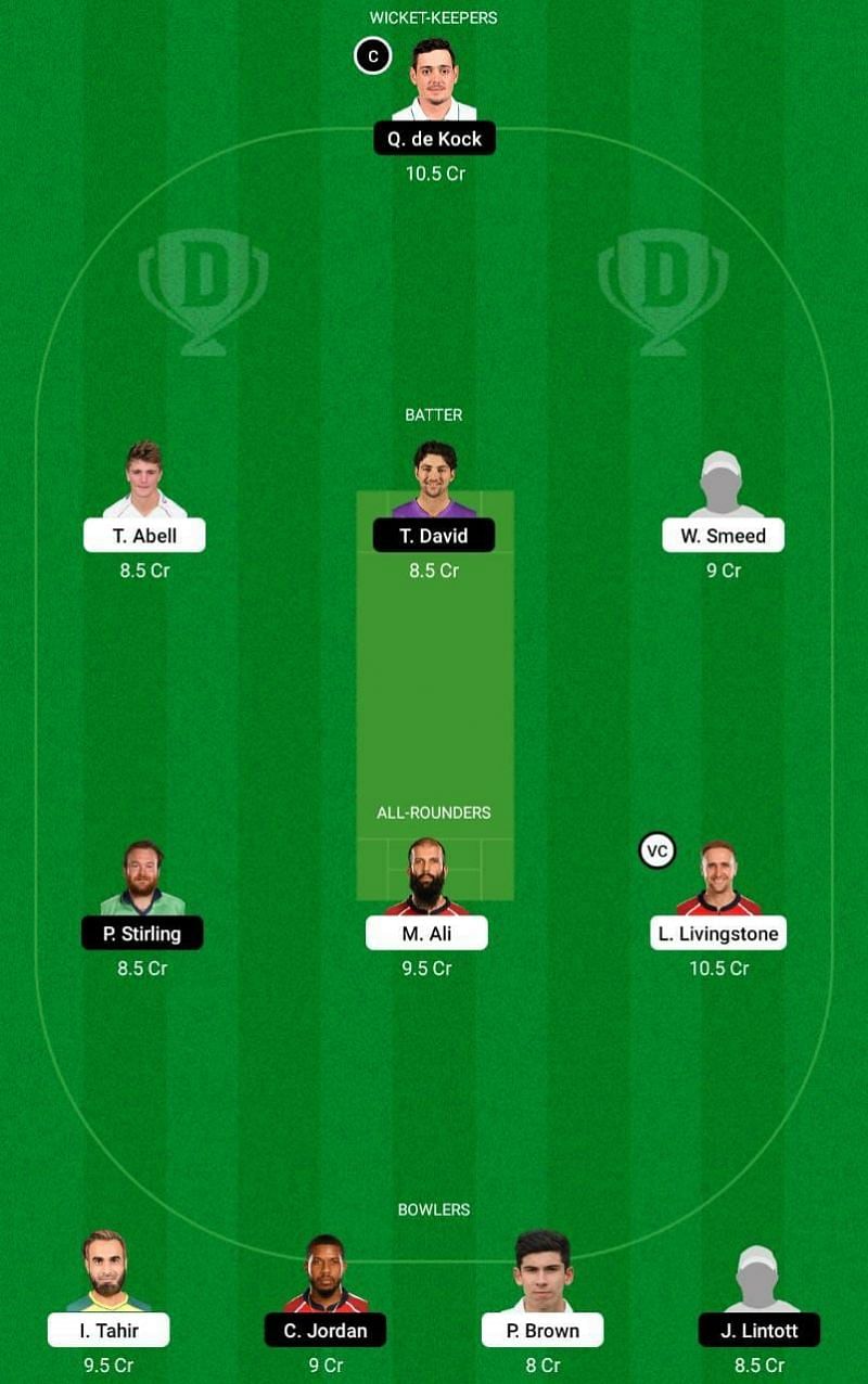 Fantasy Suggestion #1: Quinton de Kock, Tim David, Will Smeed, Tom Abell, Liam Livingstone, Moeen Ali, Paul Stirling, Chris Jordan, Imran Tahir, Jacob Lintott and Patrick Brown