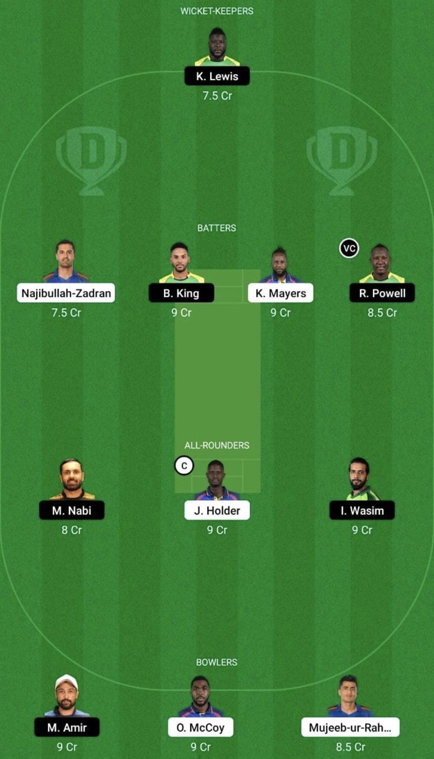 Rakheem Cornwall, Kyle Mayers (c), Harry Tector, Azam Khan, Najibullah Zadran, Devon Thomas (wk), Jason Holder, Mujeeb ur Rahman, Hayden Walsh, Obed McCoy and Ramon Simmonds.