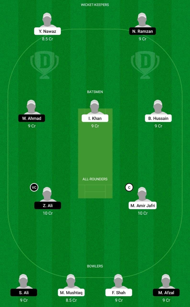 Fantasy Suggestion #1: N Ramzan, Y Nawaz, I Khan, W Ahmad, B Hussain, M Amir Jafri, Z Ali, F Shah, S Ali, M Mushtaq and M Afzal