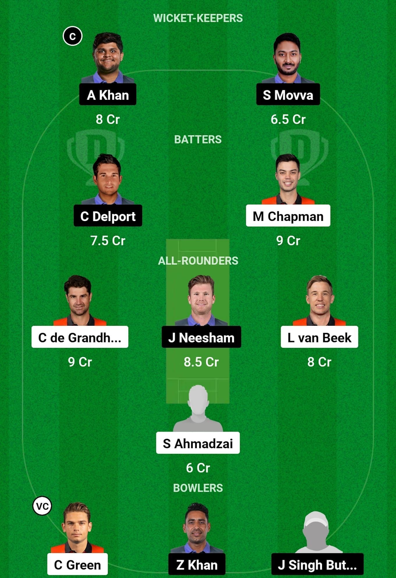 U Khan (wk), Max O'Dowd, Mark Chapman, Hussain Talat, Colin de Grandhomme, R Cheema, C Green, Logan van Beek, Tim Southee (c), S Ahmadzai, and J Gordon.
